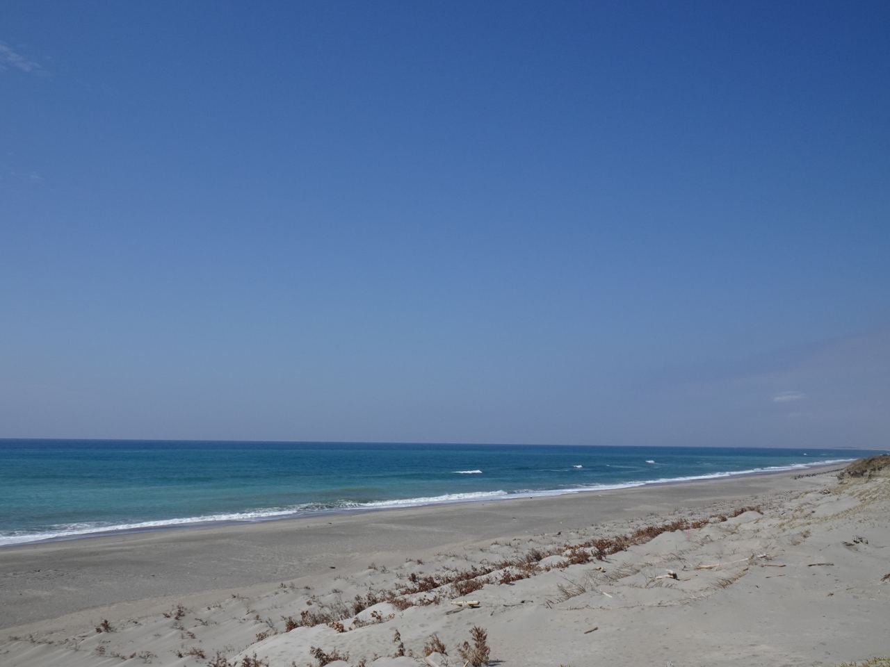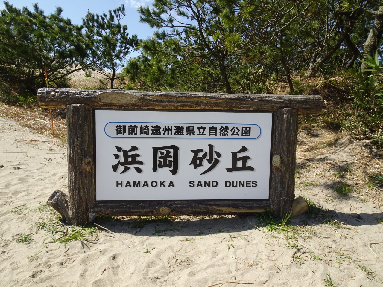 御前崎の西側、遠州灘に面する浜岡砂丘。案内板の解説によれば天竜川から流出した土砂が潮流に運ばれ形成されたとのこと。