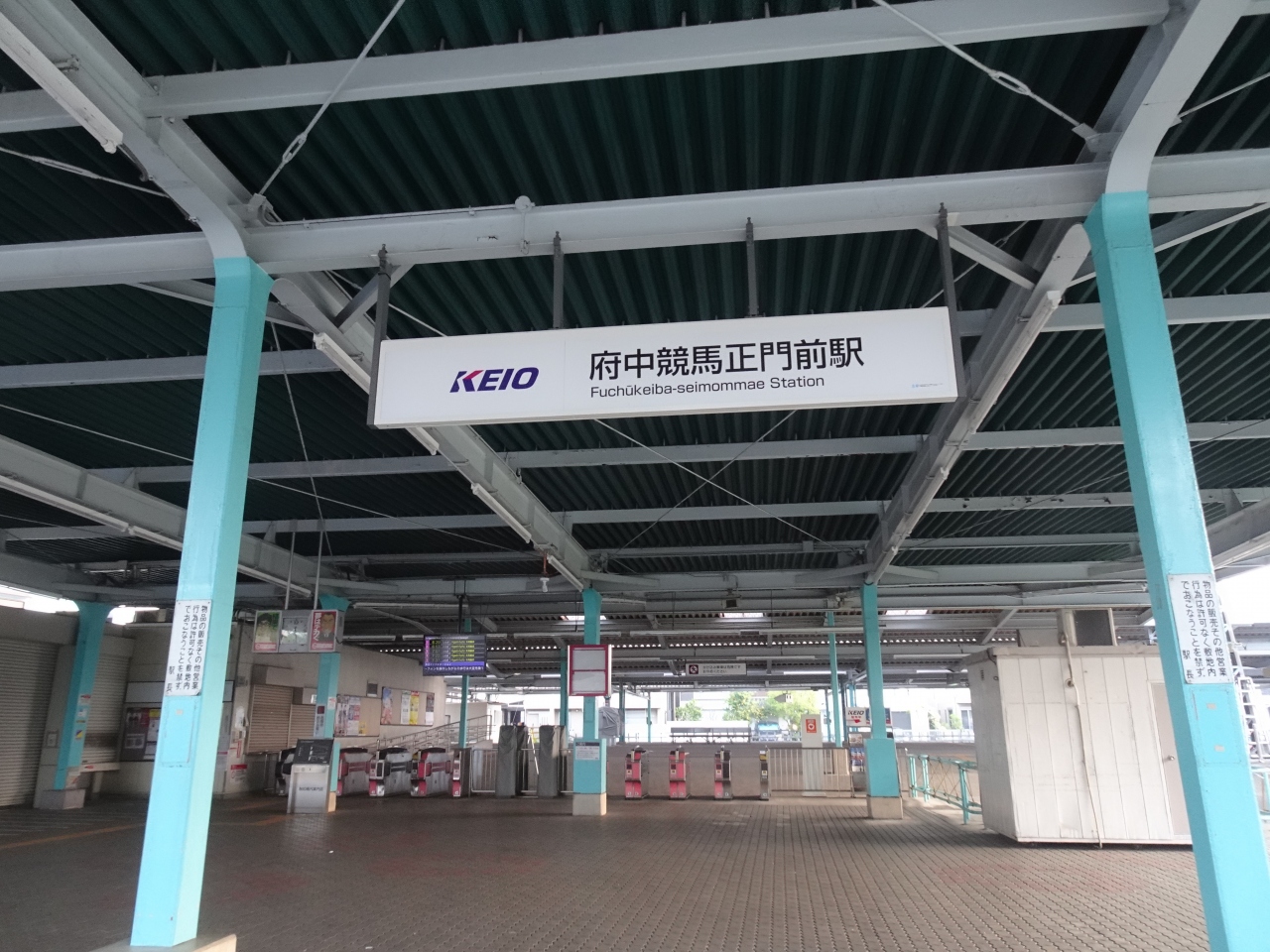終点の府中競馬正門前駅の改札口は1か所のみ、終点に向かって先頭車両の利用が便利です。