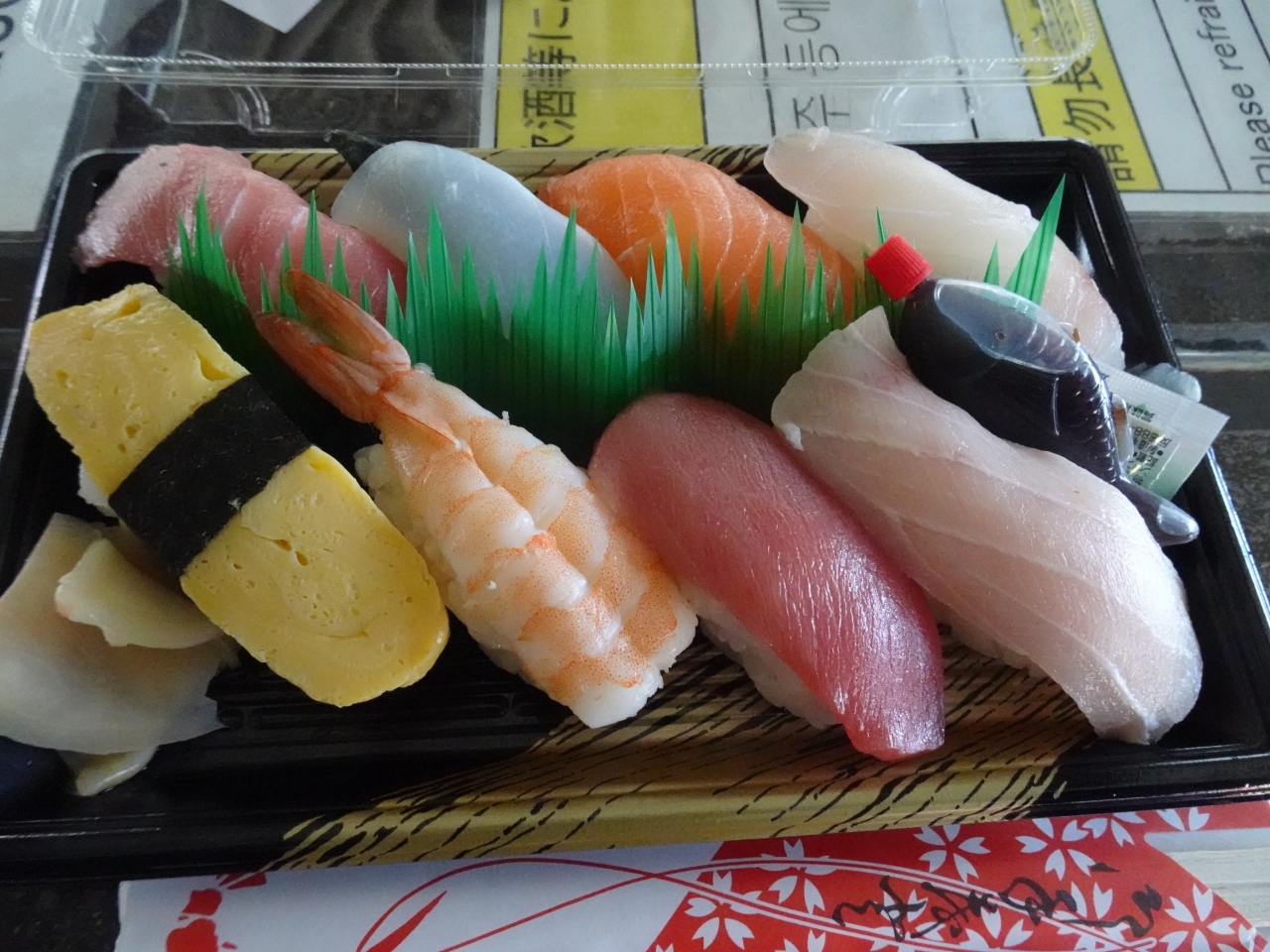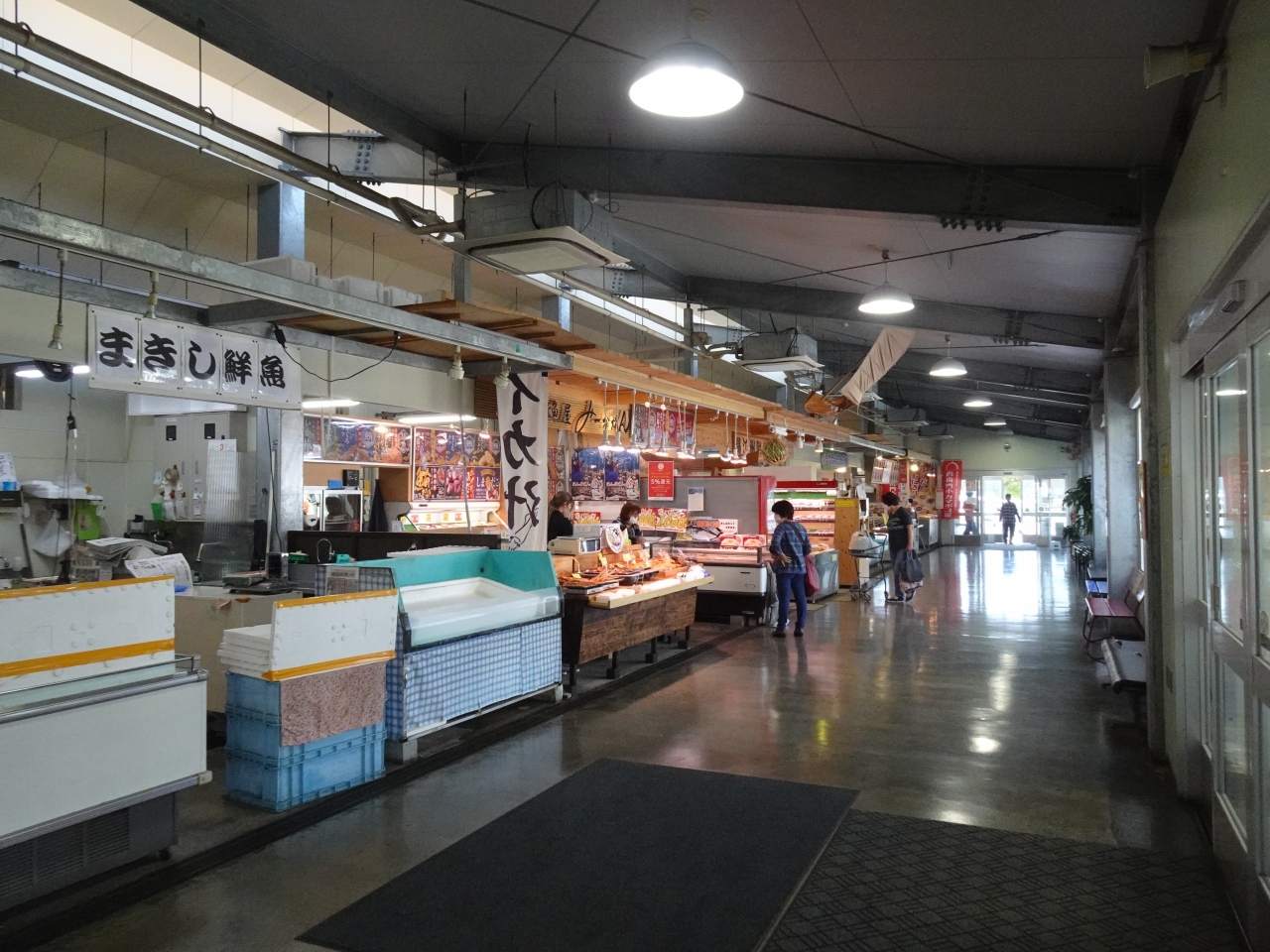 建物の中に複数の店が並び、ご飯を買ったうえで好きな刺身などを選んで乗せる勝手丼が人気のようです。際限なくネタを選んでしまうと心配な向きには、パックされた海鮮丼や握り寿司などのメニューもあり、いずれもワンコインちょっとくらいと良心的な価格設定でした。