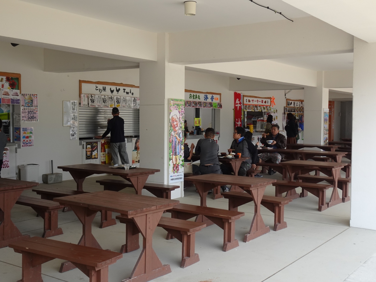 中央の休憩所には大屋根があり、強い日差しを遮り心地よい風が吹き抜け快適な場所です。駅内で好みの食料を色々物色して休憩所で食べるのもお薦め。