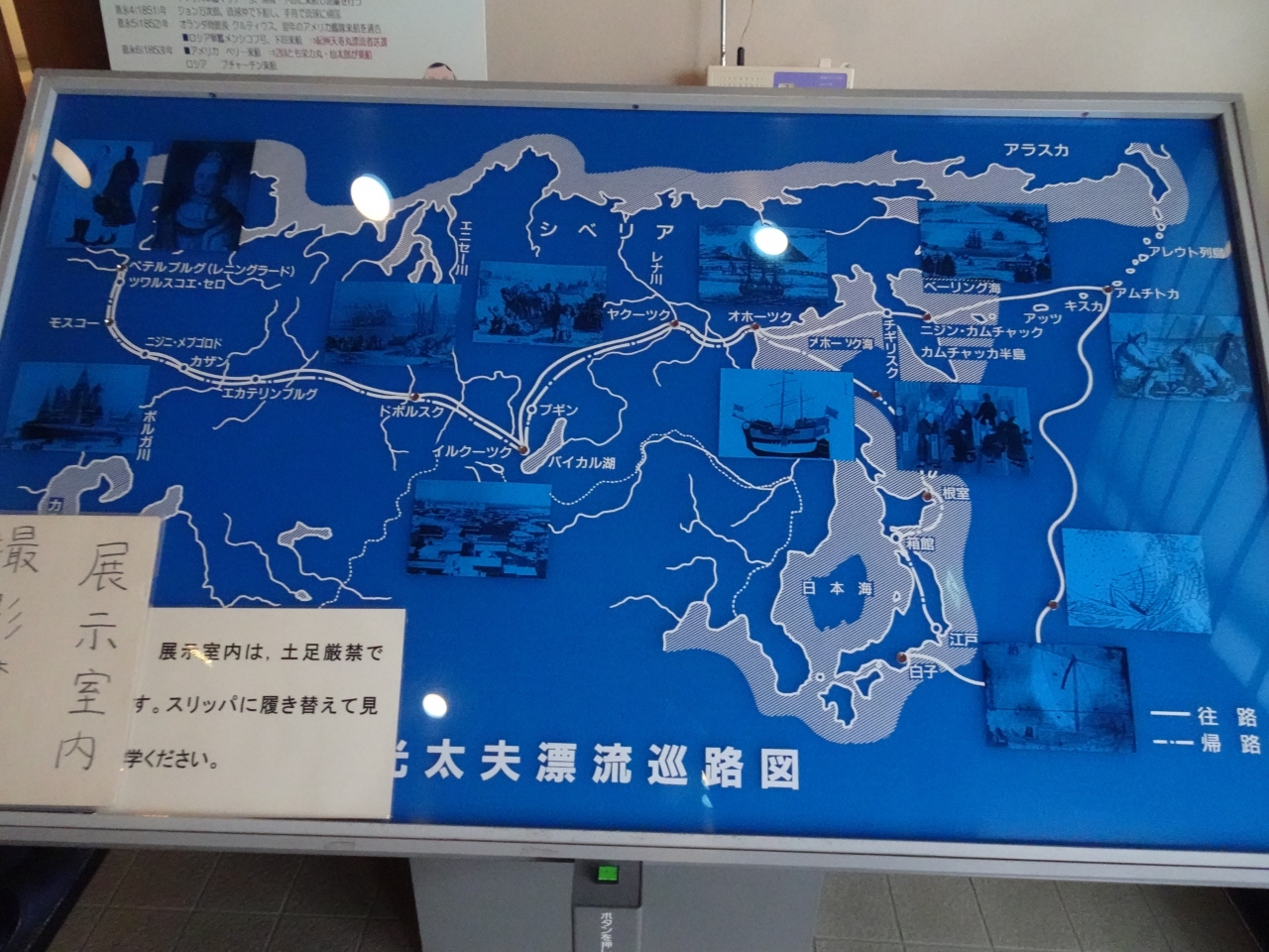 館内は歴史年表のほか運搬船「神昌丸」の模型、当時光太夫が描かれた絵画などの資料が展示。また訪れた時は「光太夫がかいたロシア文字」という企画展が開催され、光太夫直筆の墨書など貴重な資料を見ることができました。(展示室内は撮影禁止)