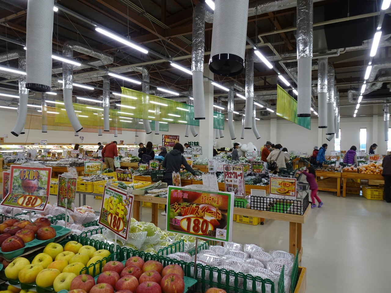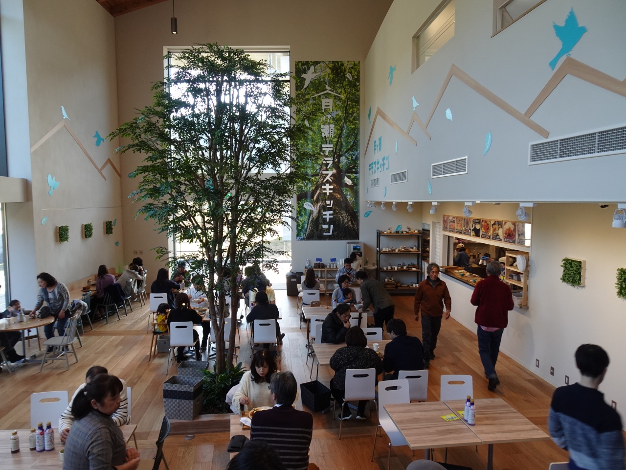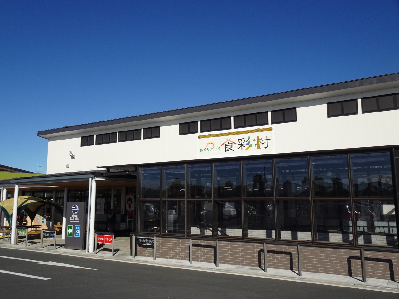 「あぐりパーク食彩村」は食品スーパーの役割を果たしているのか朝から地元の人で賑わっていました。また「Tomate」は地元の食材を使ったグルメの店が多く、中央の木目調のフードコートで食べることもできます。