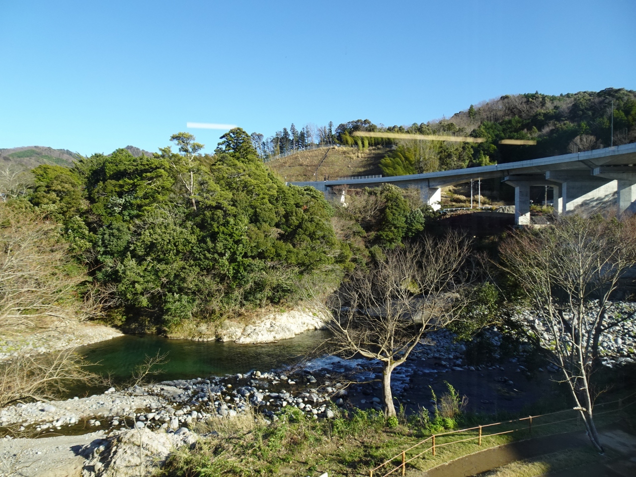 狩野川沿いの高台に建ち、ガラス張りの休憩所からの眺望は良好。ただし段差のある敷地に建築したため、レストラン「月ケ瀬テラスキッチン」で食事をするにはワンフロア下る必要があります。