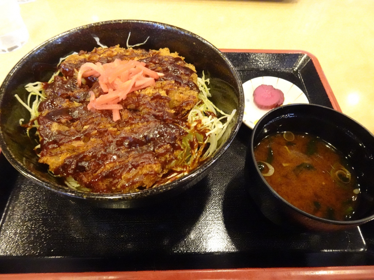 地元特産の巨大な椎茸のフライがご飯とキャベツの上にどかんと乗り、見た目はソースカツ丼そのもの。椎茸のフライはさくっとした食感で味はさっぱり、とてもヘルシーでした。
