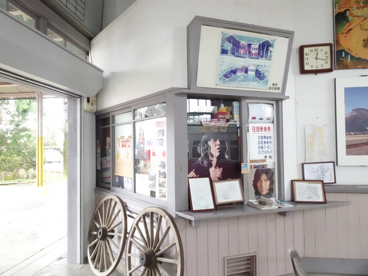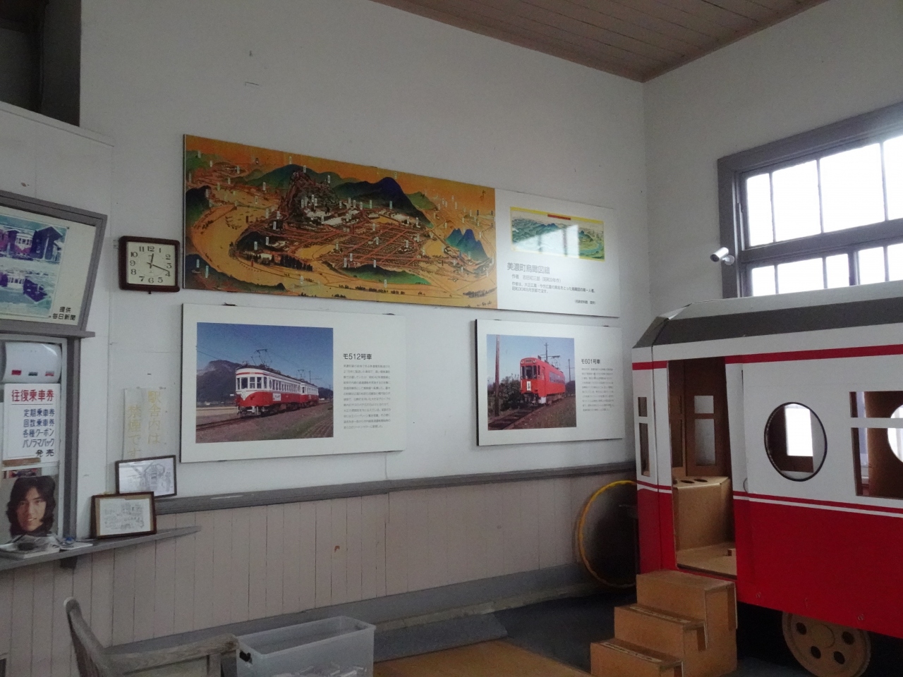 駅舎は大正期のもので登録有形文化財に国から指定、ピンク色の外観の建物はなかなか瀟洒です。駅舎内は一般に公開され、窓口などは当時の雰囲気たっぷり。美濃市出身の歌手野口五郎さんのポスターが壁の至る所に貼られ、また無人での物販が行われています。購入した代金は駅舎保存のための義援金になるとのことで、微力ながら全国路線バスのチョロQから1台お土産として買いました(鉄道グッズはほとんどなかったようです)。