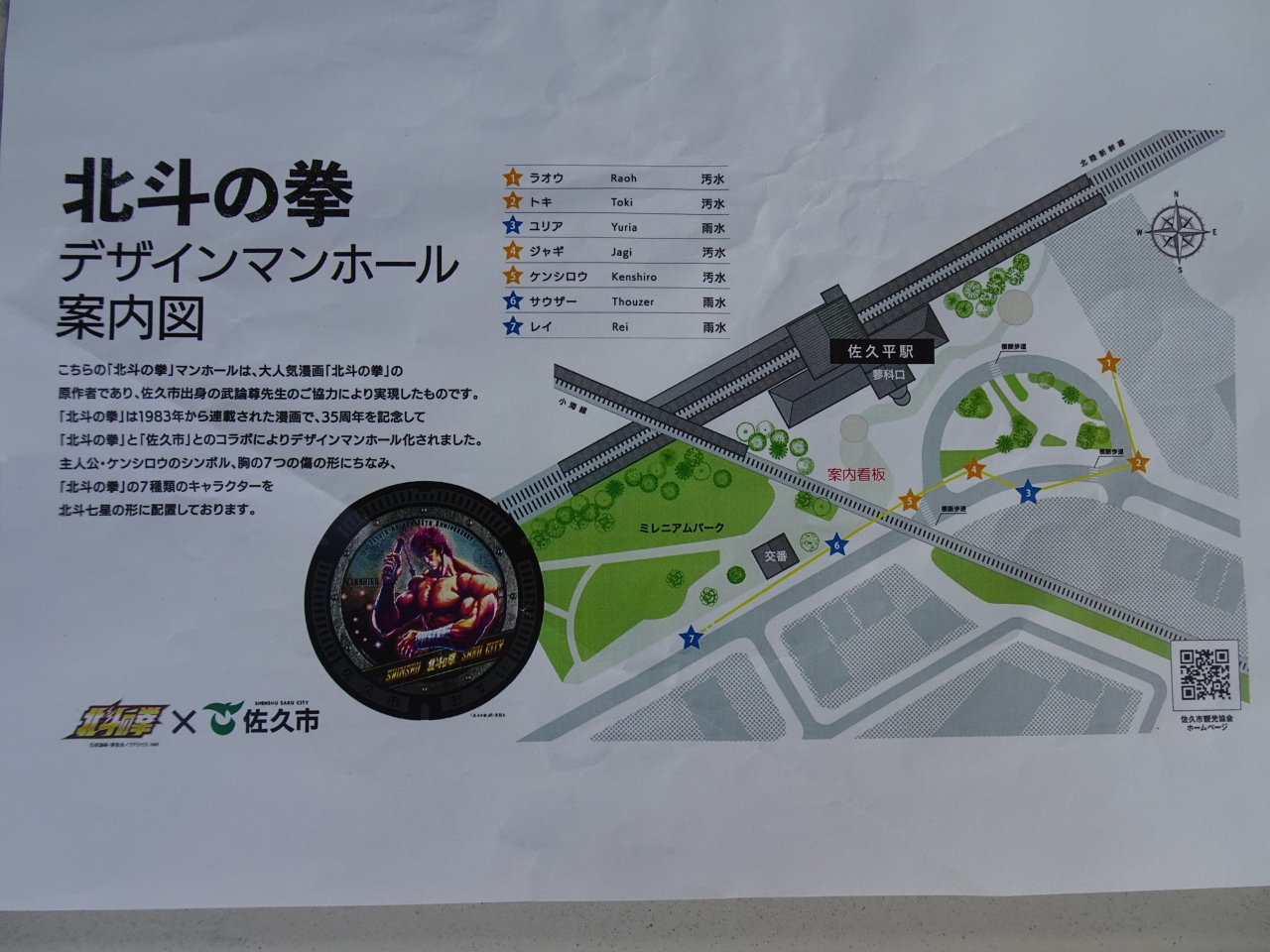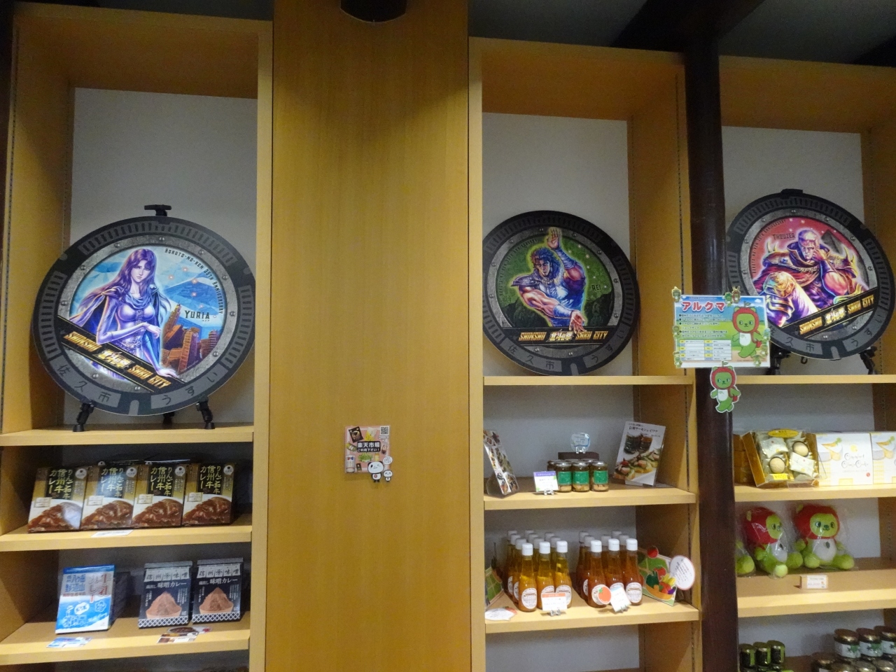 また佐久市は漫画「北斗の拳」の原作者武論尊氏の出身地。フロアにはキャラクターたちのデザインマンホール蓋のレプリカが飾られているのが特徴。実際の7種類のマンホール蓋は駅前に北斗七星型に設置され、案内図を店舗併設の観光案内所で頂くことができます。