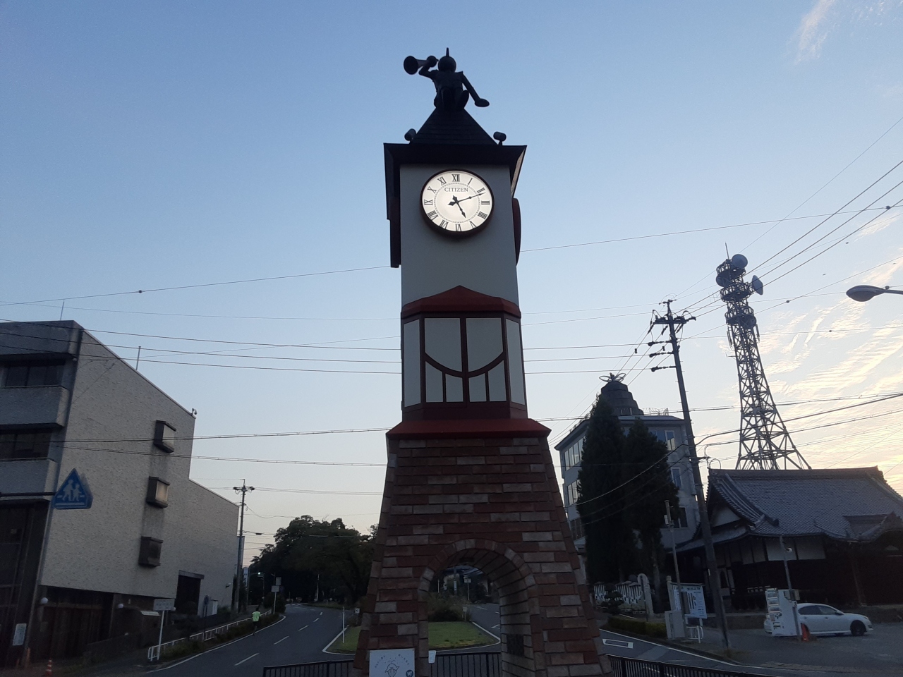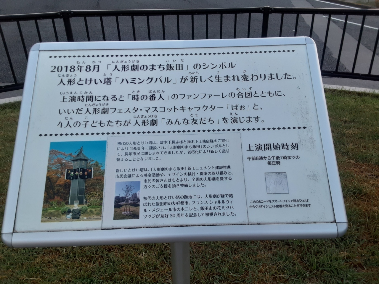 飯田市の中央公園沿いに立つ時計塔。毎年人形劇フェスタが開催される飯田の街を象徴するように、この時計台では日中の毎正時に扉が開き、人形劇の上演が行われるとこと。