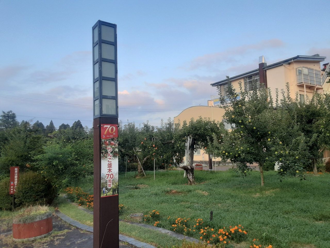 300メートルほどの道路中央には緑地帯が設けられ、手の届くところにりんごの実がなっています。並木道の途中には東屋や水飲み場が設けられ、市内散策中の休憩にも適しています。