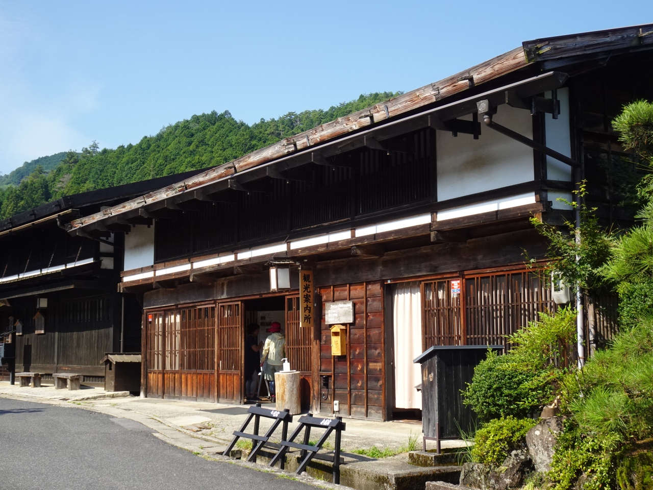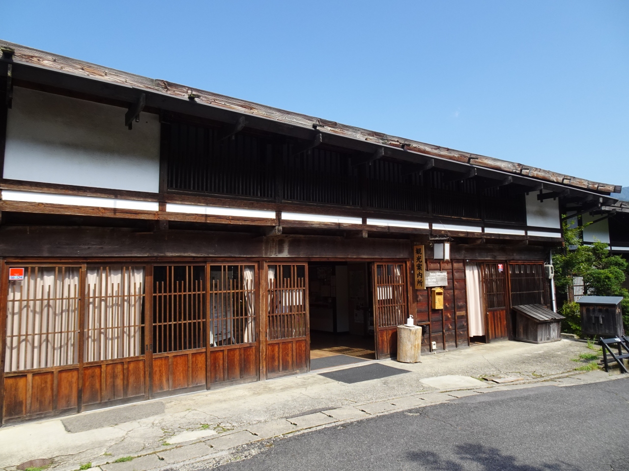 妻籠宿の中央付近に位置し、格子戸のある木造の建築物をそのまま利用した施設です。近づいて「観光案内所」の小さな看板を確認しなければ分からないほど、宿場町の街並みに同化しています。