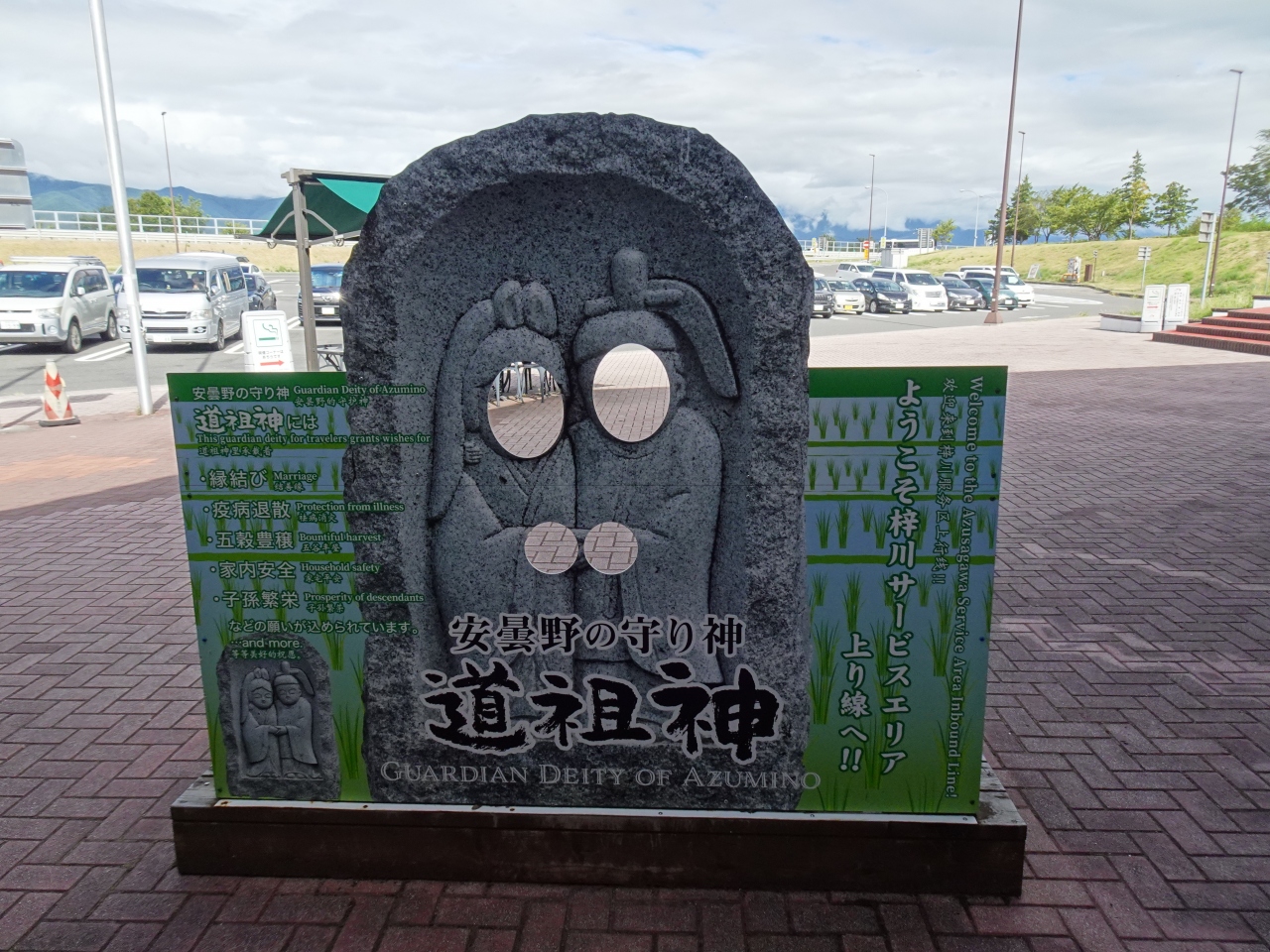 施設内の一角には公園が整備され、天気が良ければ北アルプスを眺めながらの休憩も可能。山並みを背景に、道祖神の顔出しパネルで記念撮影もできます。