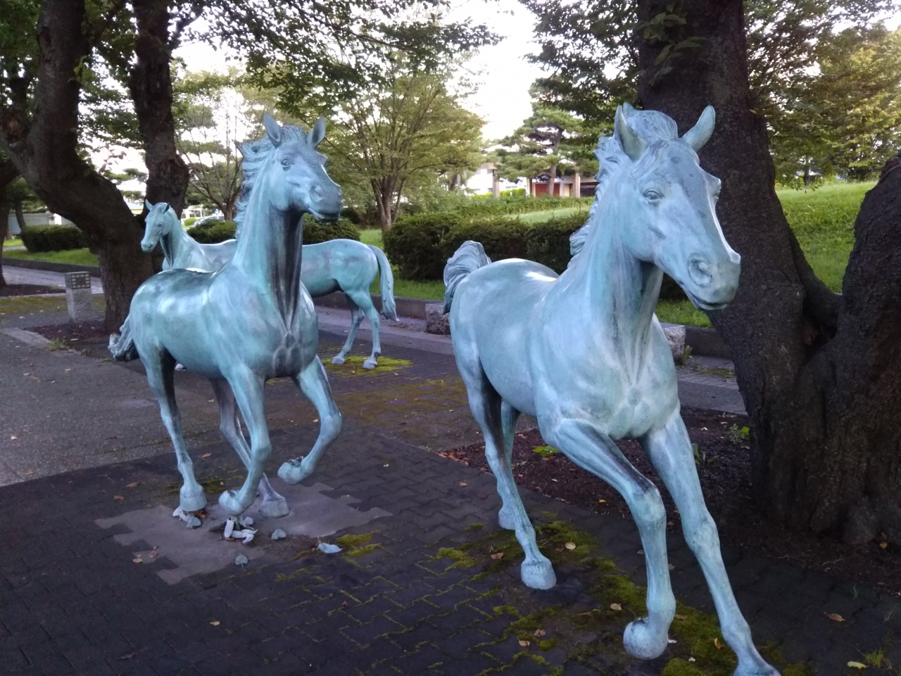 - 桜と松並木が続く道。馬などのオブジェもあり