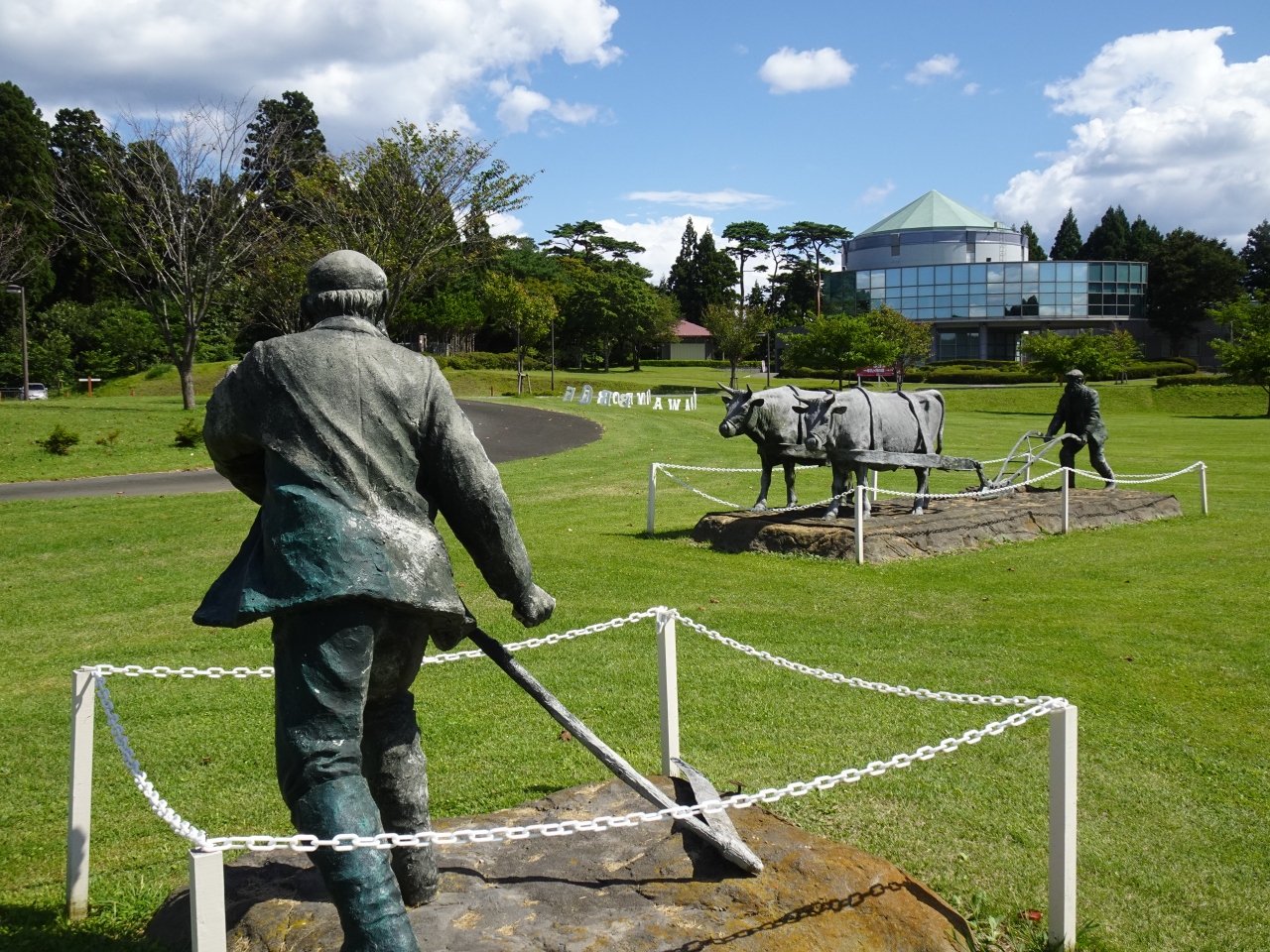元は会津藩士広沢安任が斗南に移封された後にこの地で洋式牧場を開設したとのことで、芝生の上には馬や牧夫たちの象が建つなど牧歌的な雰囲気を感じられます。