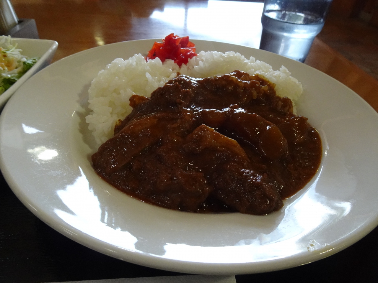 こちらで代表的な料理は「アランドロンカレー」。カレー中央のライス上に球体のハンバーグが鎮座したメニューです。ハンバーグを切ると中からとろりとチーズが流れ出る仕掛けでいわゆるインスタ映えが楽しめます。もちろん見かけだけではなく味にも満足。