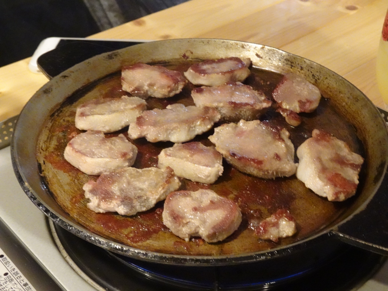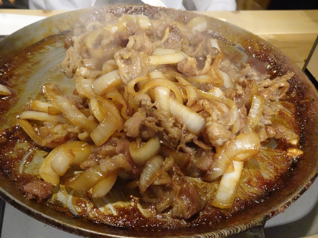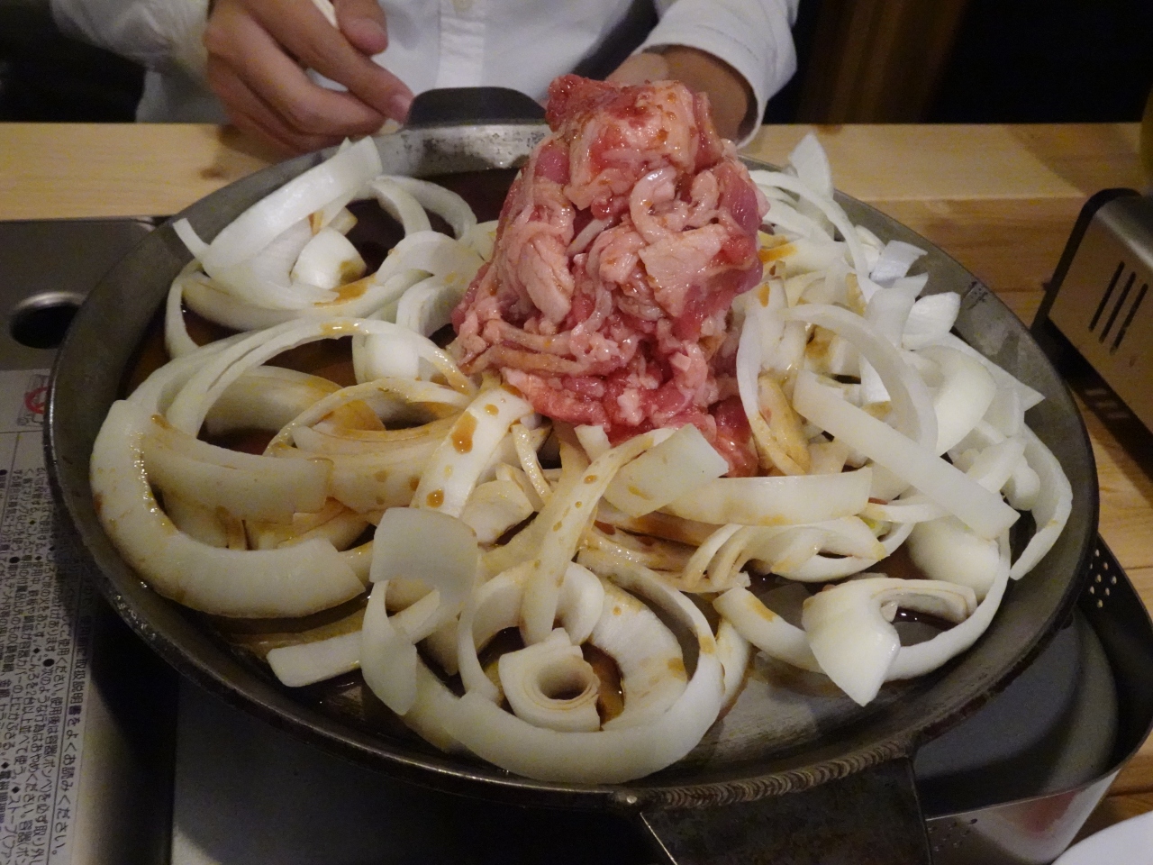 バラ焼きをオーダーすると、たくさんの玉ねぎと中央に塔のように盛られた肉を乗せた鉄板が運ばれテーブル上で焼き上がるのを見守ります。焼き方や加減は店員さんが教えてくれました。(もちろん日本語で)