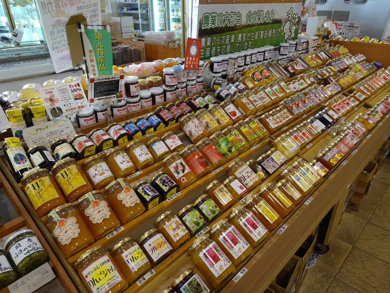 中規模な道の駅ですが、直売所は広々としていて農産物が豊富。特に周辺はりんご畑が多く、りんごなどを使ったジャムが陳列棚にずらっと並んでいるのは圧巻、価格も比較的手ごろです。