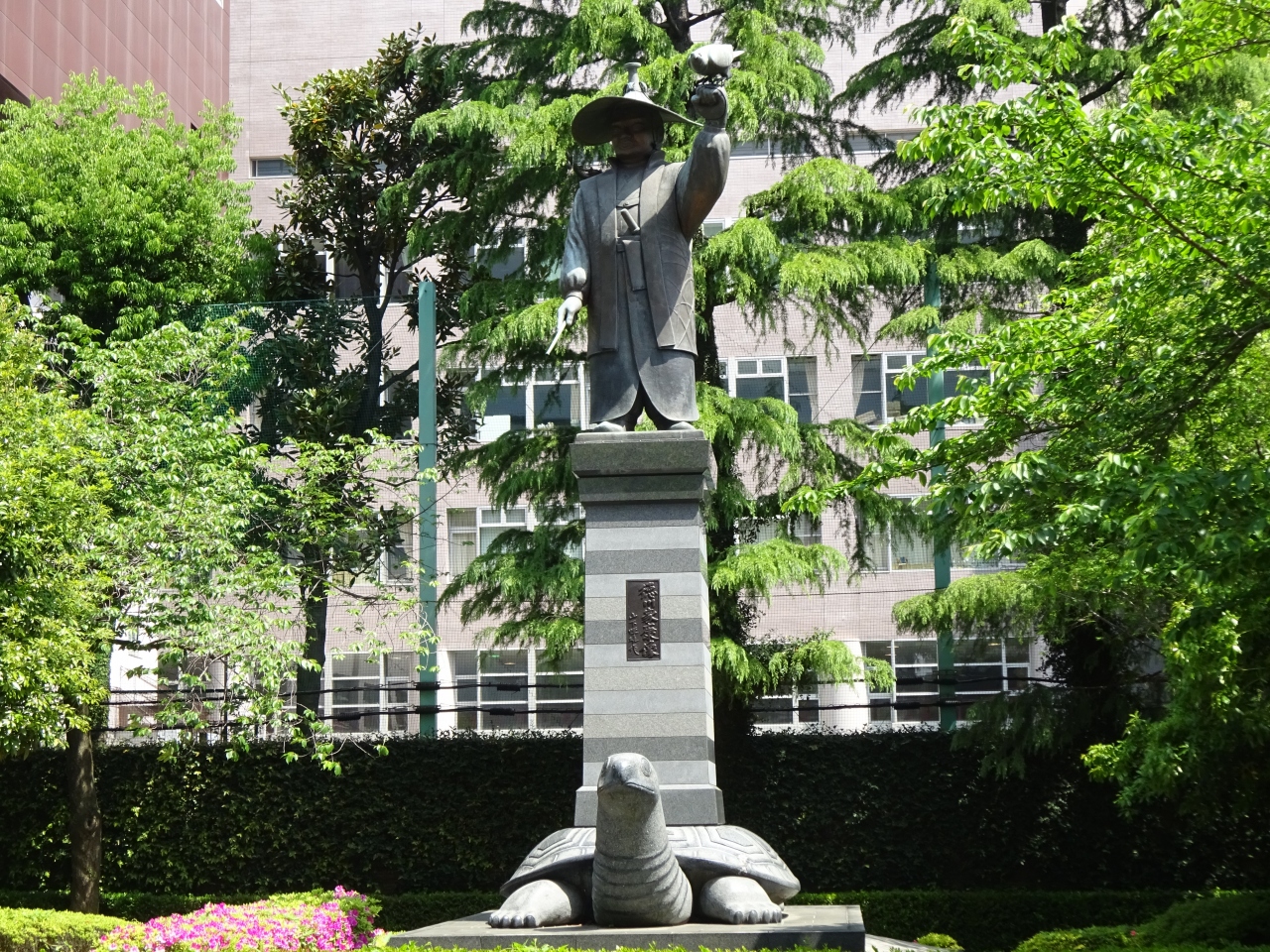 大江戸線の両国駅方面から江戸東京博物館のJR駅寄りの入場口に向かう際たまたま見つけました。突然現れた変わった構図にびっくり。左手から鷹狩をしているんだなと分かるのですが、台座の下の亀のような動物が何とも不可解です。