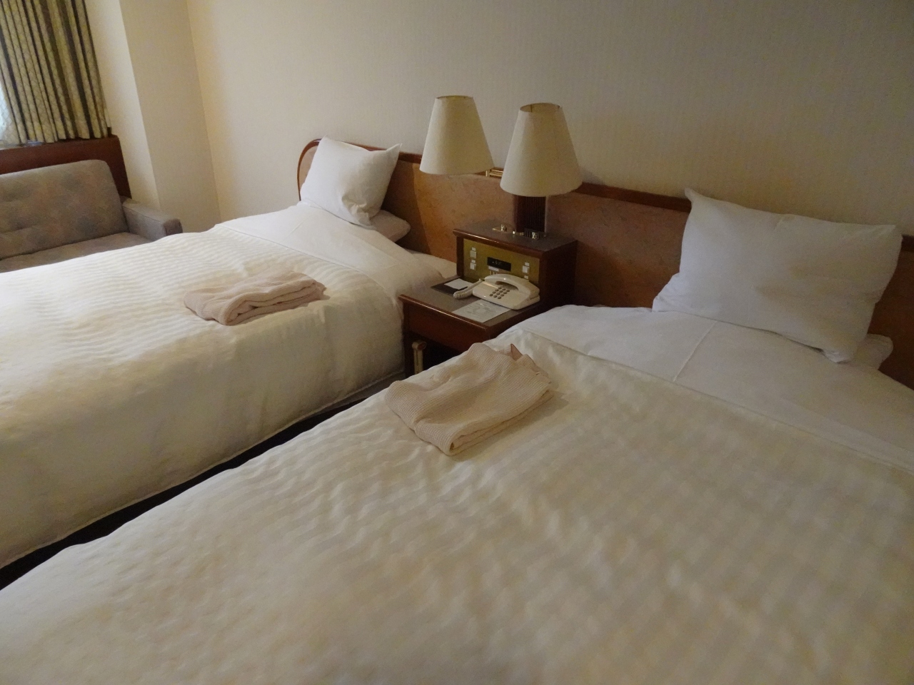 ツインルームの広さはまずますですが、室内は古さを隠せず。ソファのスプリングはベコベコで繕った跡あり。コンセントの数も少なく、持参した電源タップが役に立ちました。