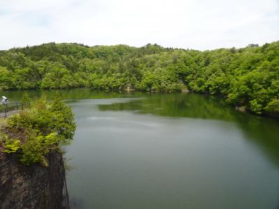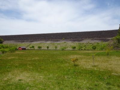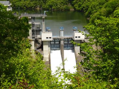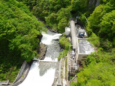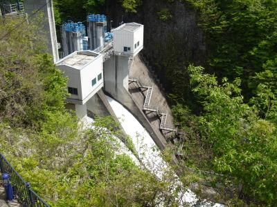 堤高約48メートルとそれほど規模は大きくありませんが、天端より一段高い位置から俯瞰することになるので、ダム全体の構造などがよく分かります。5月の大型連休時に訪れたところ放流を見ることができました。