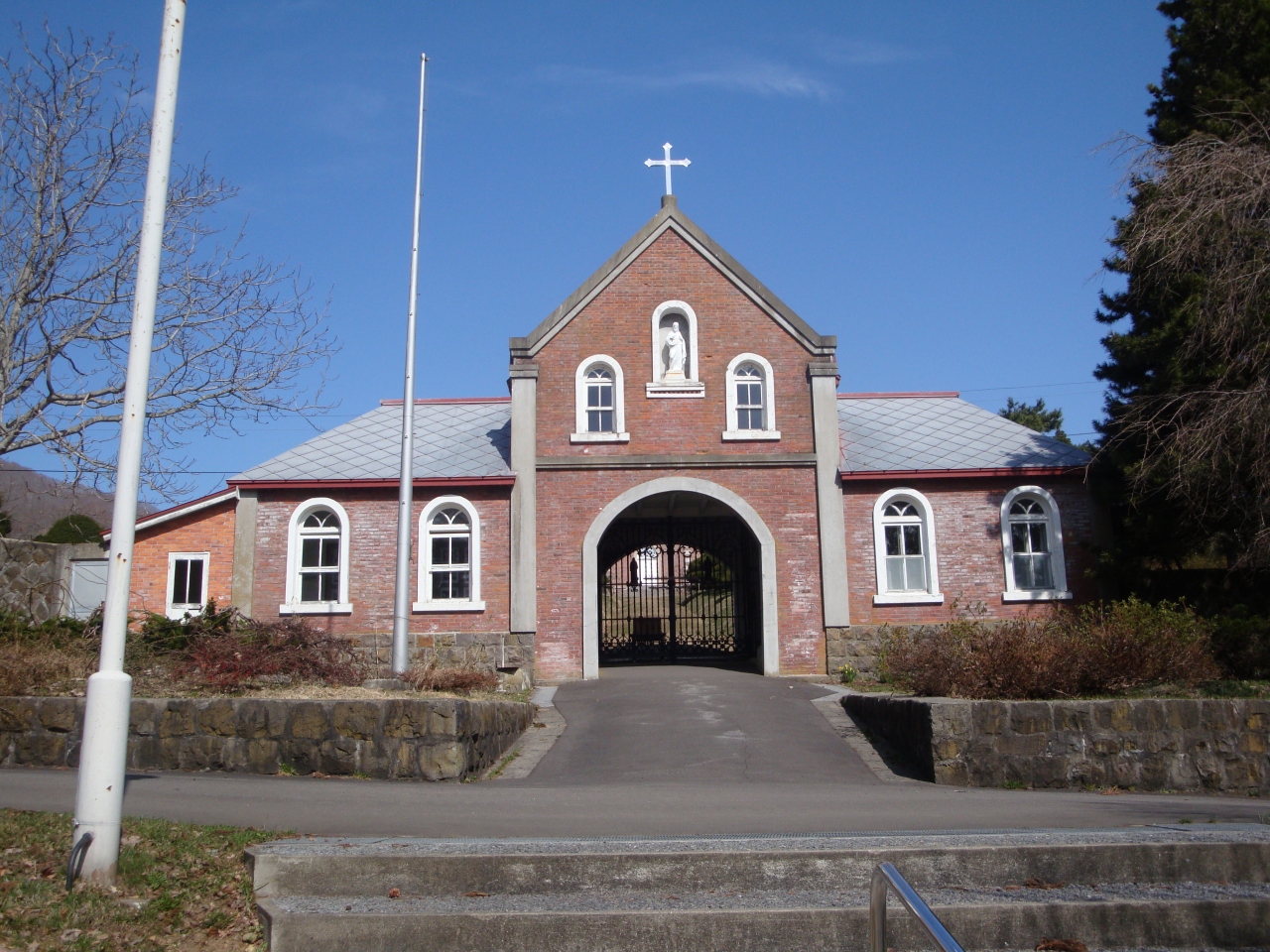 北海道らしいポプラ並木を両側に見て、真っ直ぐ進んだ奥に修道院の門があります。