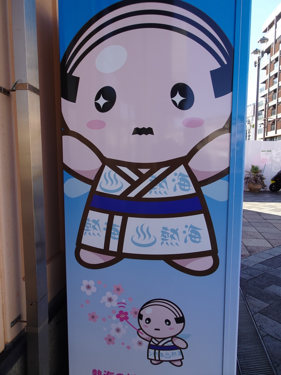 熱海温泉ホテル旅館協同組合公式キャラクター「あつお」ラッピングの自販機が建物前に設置されユニークです。- 旅行時期