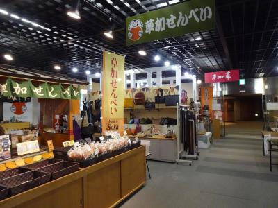 草加市のアンテナショップでもあり、一角には草加せんべいやレザー小物などの販売も。せんべいには複数のブランド・種類があるので土産選びが楽しめます。
