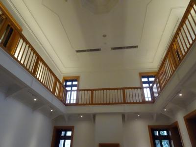 入口部分は銀行の店舗だった大正期の歴史的建造物。現在内部はエントランスホールとして利用され、白壁と回廊がある開放的な空間となっています。