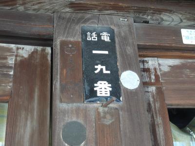 新しい建物が目立つ通りの中で、明治38年建立の土蔵造りの店蔵は圧倒的な存在感を示しています。入口は閉ざされ内部を見学することはできませんが、壁に貼られた「話電 一九番」の看板(電話の右書き)と、文字がかすれた表札など歴史を十分に感じることができます。