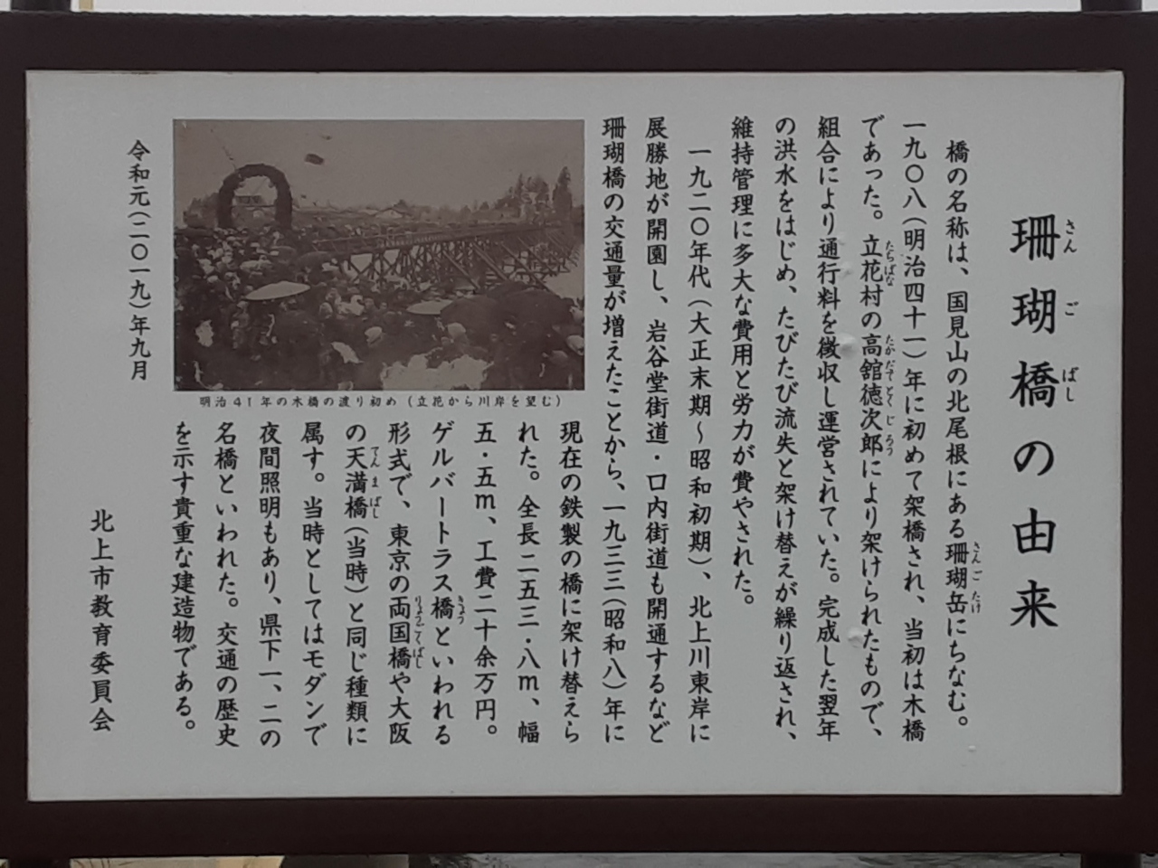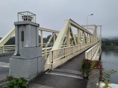 橋西側の袂には教育委員会による解説板が設置、1908年の架橋当時の様子を写真で紹介しているほか、名称の由来や1933年に現在の鉄製の橋が建造されたこと等が記されています。- 旅行時期