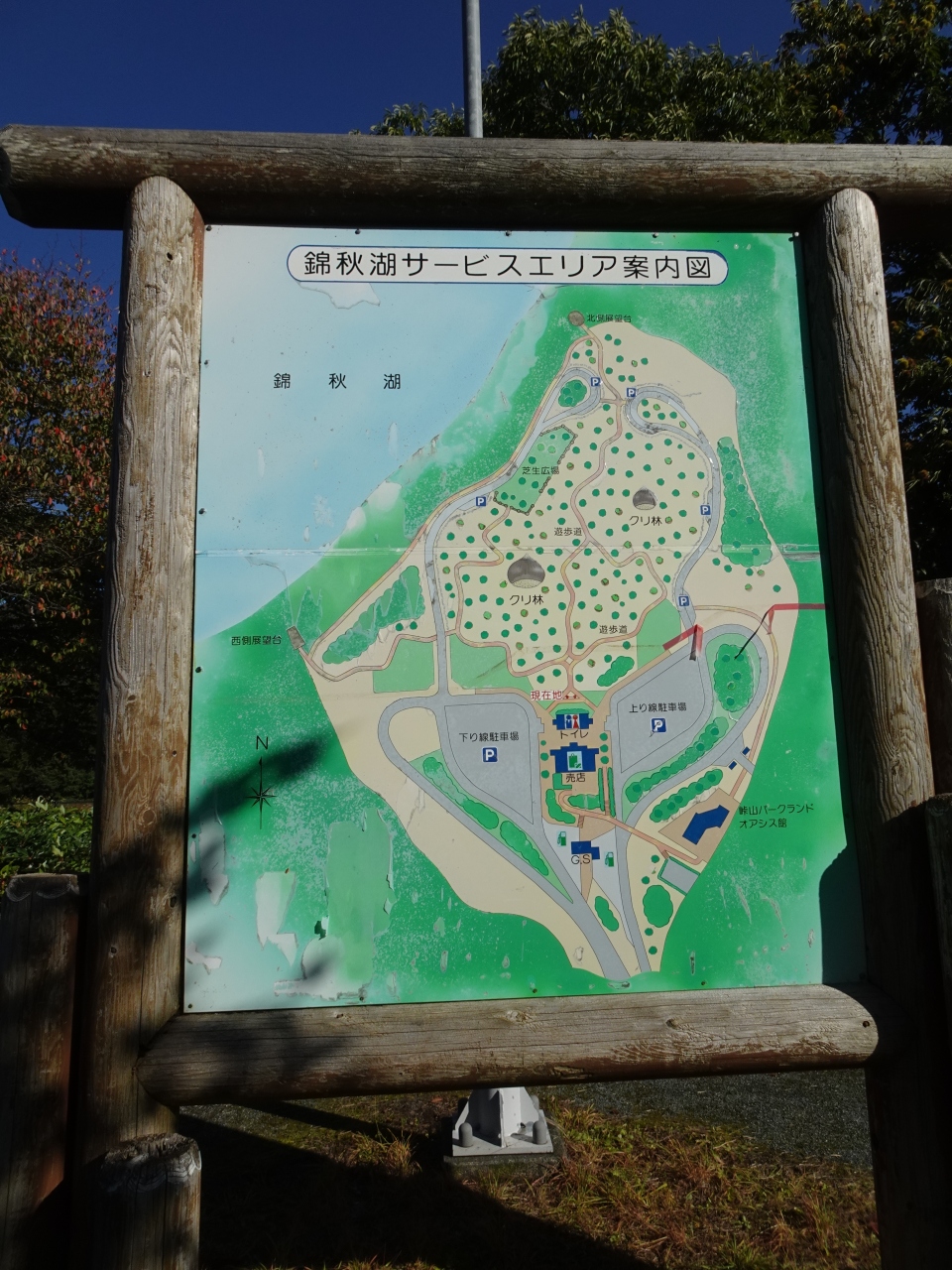 駐車場横から錦秋湖に向けて栗林が広がり、遊歩道を進めば展望所もあるとのことですが、熊出没の恐れから立入りが禁止されていました。よってSAから湖は見えません。- 旅行時期