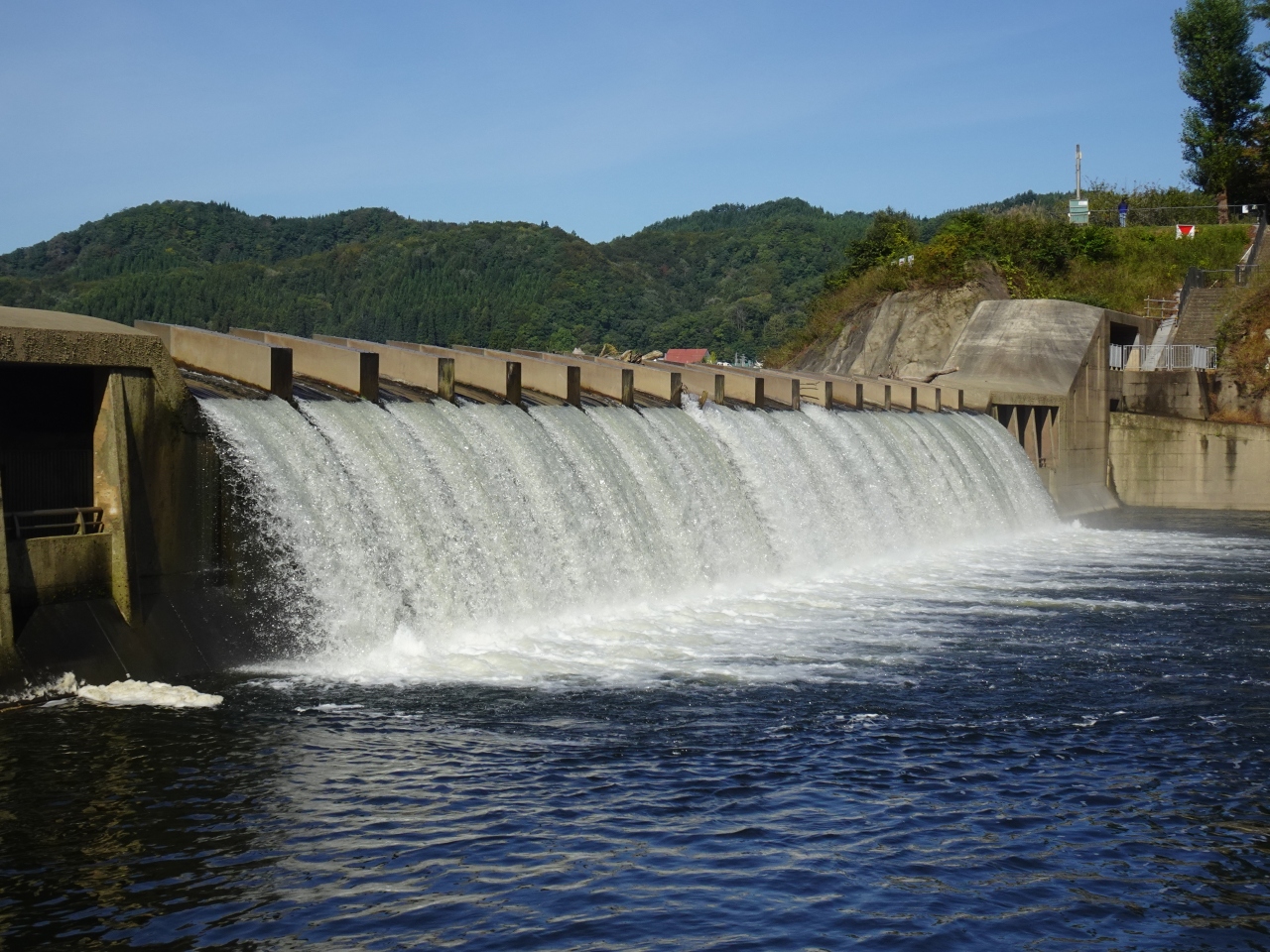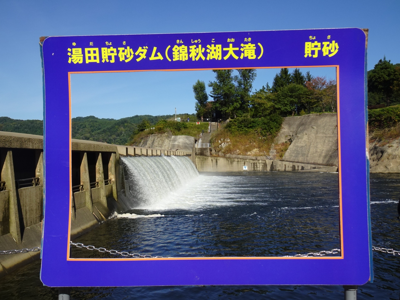 錦秋湖大滝の正式名称は「湯田貯砂ダム」。国交省管理の重力式コンクリートダムで和賀川上流からの土砂をダム湖内に堆積させるのが目的。これによって下流側の湯田ダムの貯水量減少を防いでいるそうです。