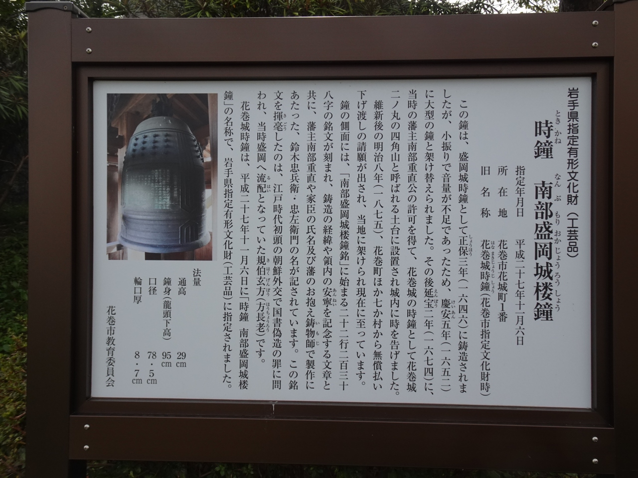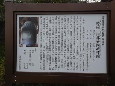 正保3年(1646年)に鋳造された時鐘。盛岡城から花巻城へと移され、明治に入って払い下げにより現在の地に架けられたとの解説があります。
