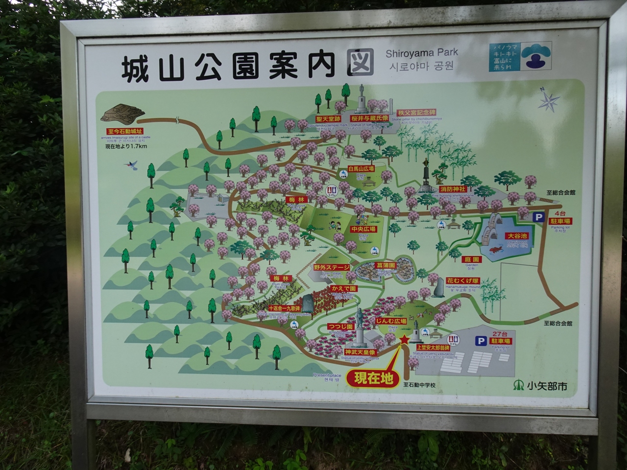 ソメイヨシノや紅葉の名所のようですが、9月中旬の園内は暑さを感じただけで特に見どころなし。駐車場からの移動は何処へ行くにも坂道を辿ることになるので、早々に引き上げました。