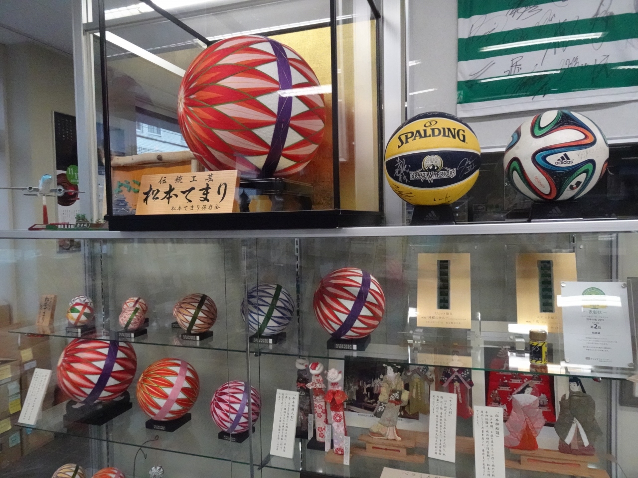 観光案内所としては内部は広め。今回は松本市のマンホールカードを頂くために訪問。カードの絵柄になっている「松本てまり」などの伝統民芸品が展示されていました。