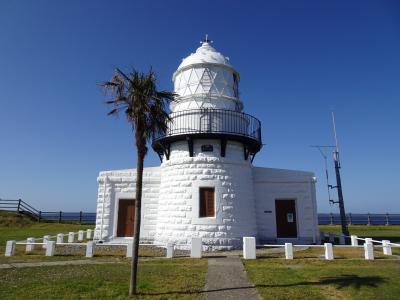 坂を登り切ると視界が開け、白亜のずんぐりした灯台が見えます。明治期の歴史ある建造物ですが、きれいに白く塗られ旧さを感じさせません。青空と周囲の芝生にもよく映えていました。
