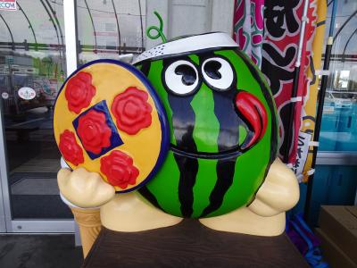 当地の特産の一つがスイカ。季節柄スイカは直売所で見かけなかったものの、すいか糖が入ったパンが売られ、他にもキャラクターの「もとなり君」はすいかをイメージ、駅内のテーブルなどもスイカの形をしているなどユニークです。
