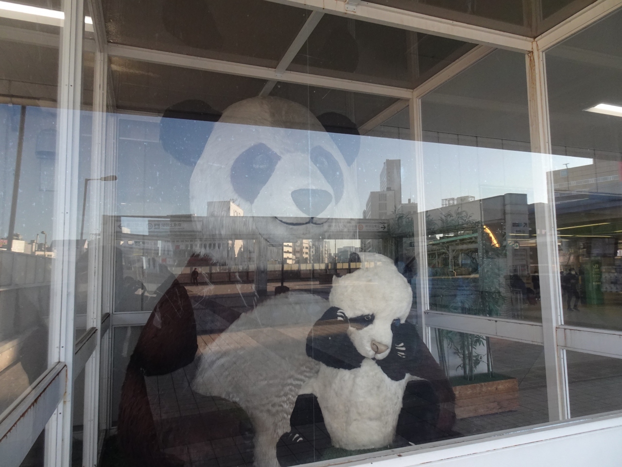 大小2体が並び親子に見えますが、小パンダは元は上野駅構内の別の場所に設置されていたようです。大パンダは実物を越える巨大さで初めて見ると迫力が。ガラスケースに収まっているものの、やや汚れているのが残念。