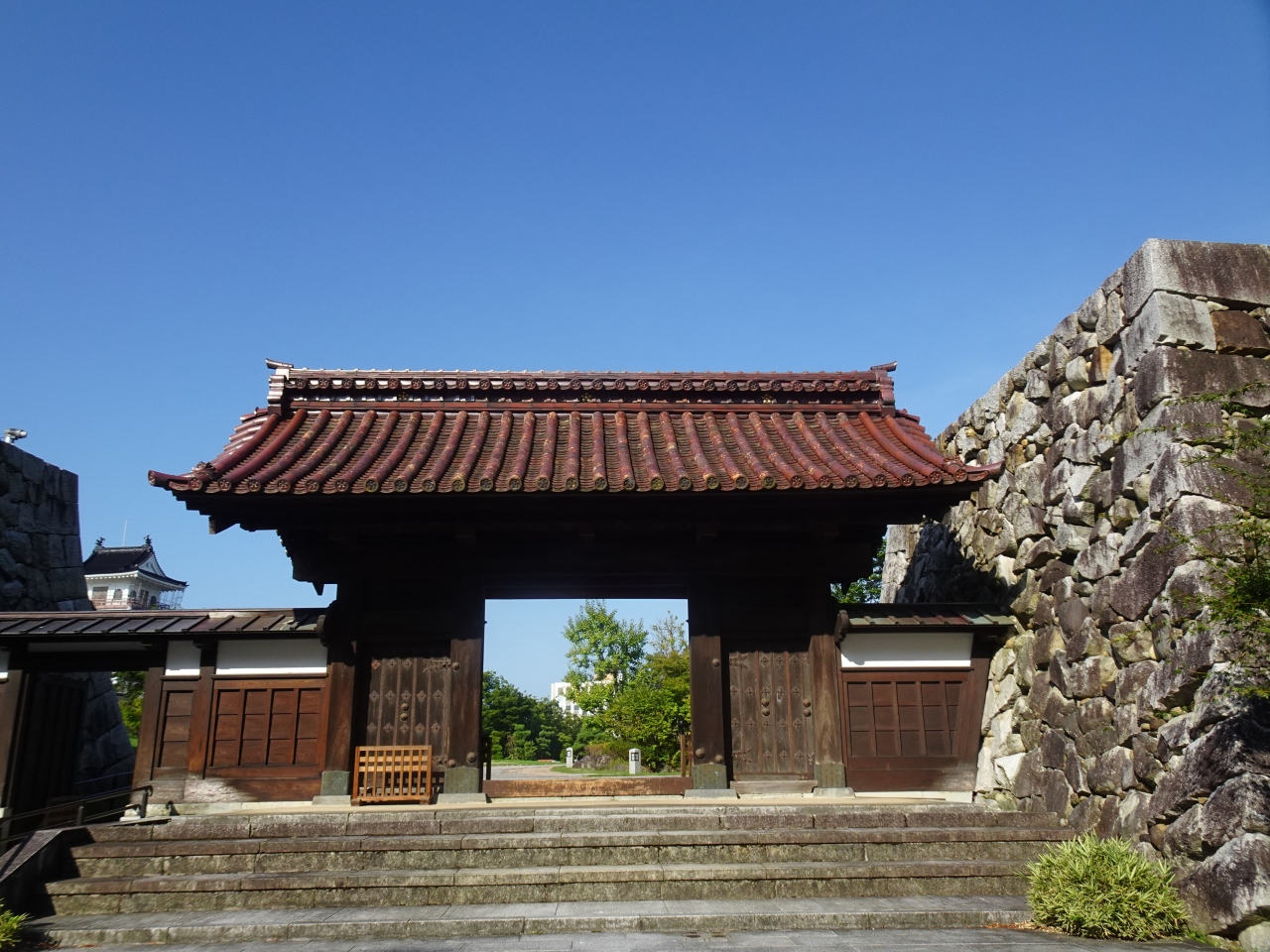 1954年に再建された富山城の天守閣は、鉄筋コンクリート造りの模擬天守そのものといった雰囲気ですが、黒の屋根瓦と白い壁が周囲の芝の緑と青空によく映えています。