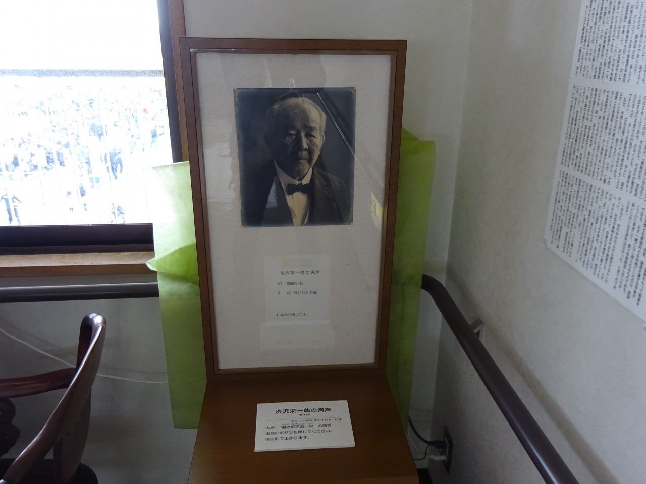 内部は写真や資料の展示がメイン。明治期の産業近代化に貢献した事業会社、現在でも経済の中枢を占める企業などの設立・運営に携わってきたことがよく理解できます。2階には渋沢栄一の生の声を聴くこともできユニークです。