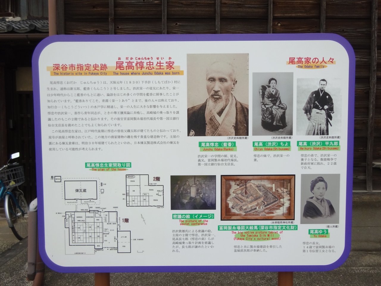 尾高惇忠生家は江戸後期に建てられた商家とのことで、建物内で惇忠や栄一などが尊王攘夷活動のための密議をしたとも言われているそうです。建物の内部や庭などが公開され、この場所から近い日本煉瓦製造㈱製のレンガが使われた土蔵や竈などを見ることができます。