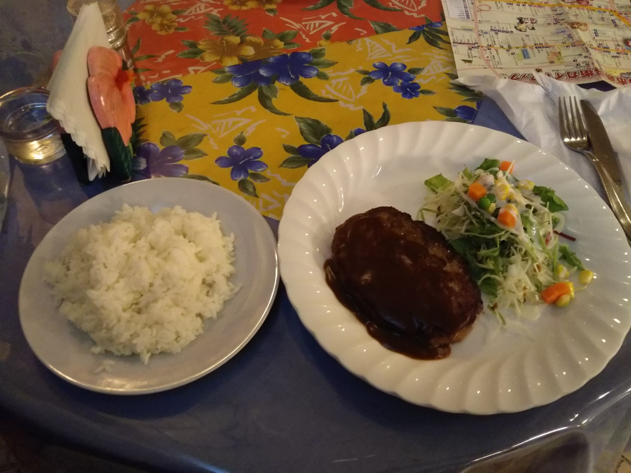 クーポンで指定されたハンバーグステーキを食べました。ハンバーグは懐かしい感じの味わい。ライスはパサパサしていましたが、これは宮古島で食べたご飯共通の印象。