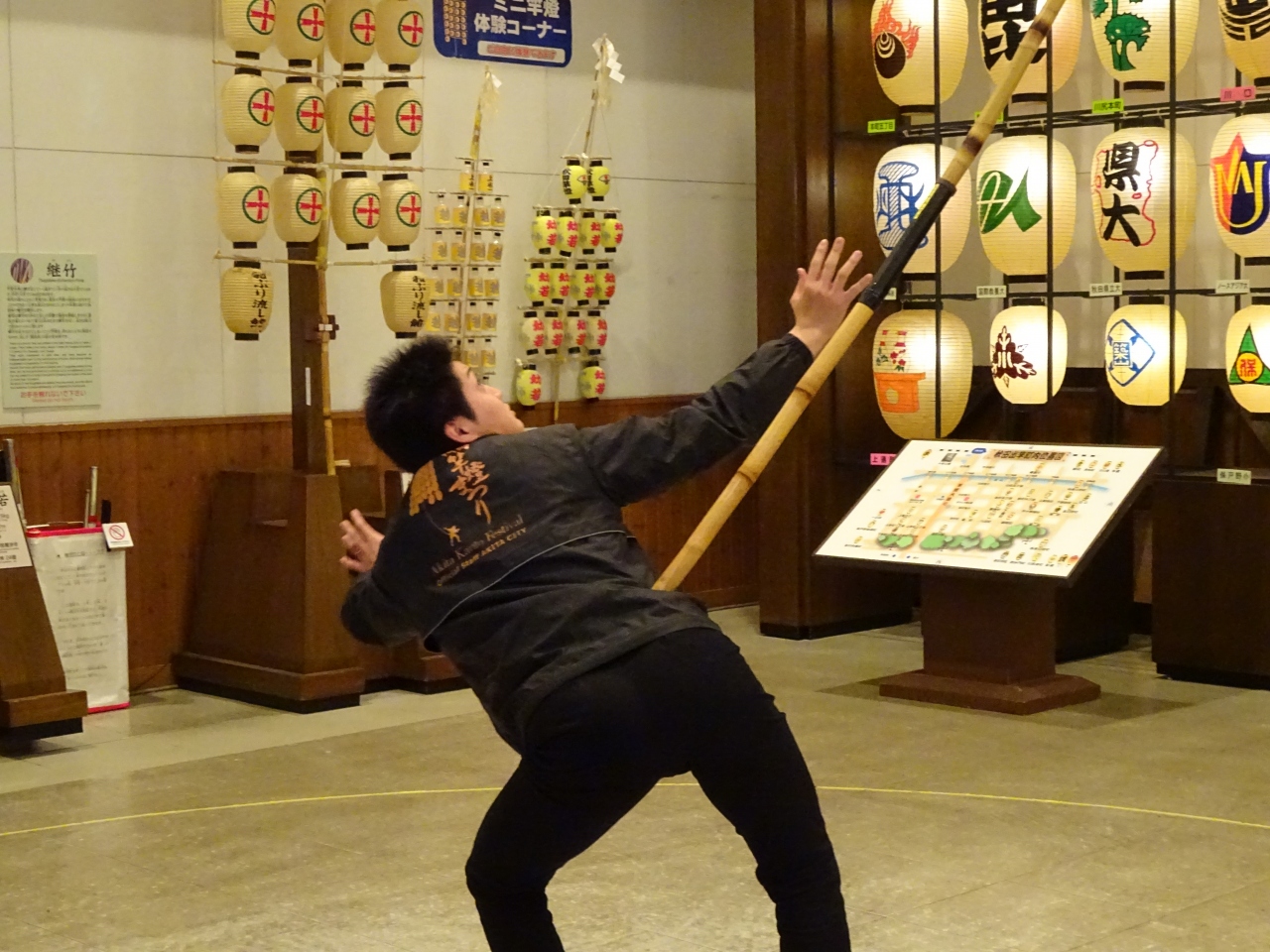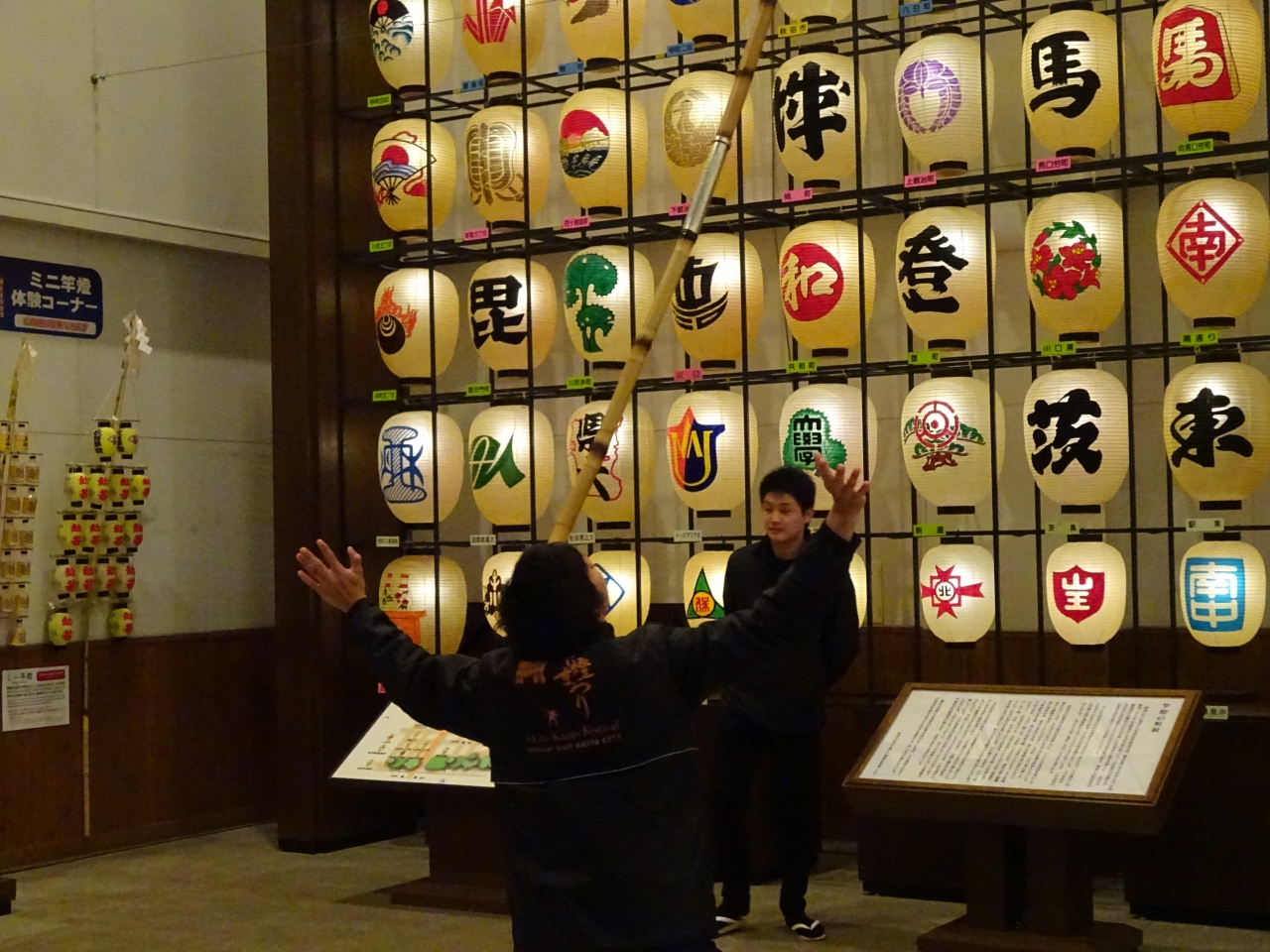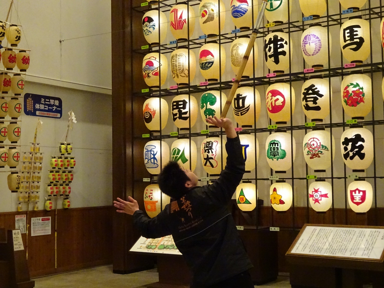 やはり目を見張るのは1階の展示ホール。天井が高く竿燈に触れることもできます。