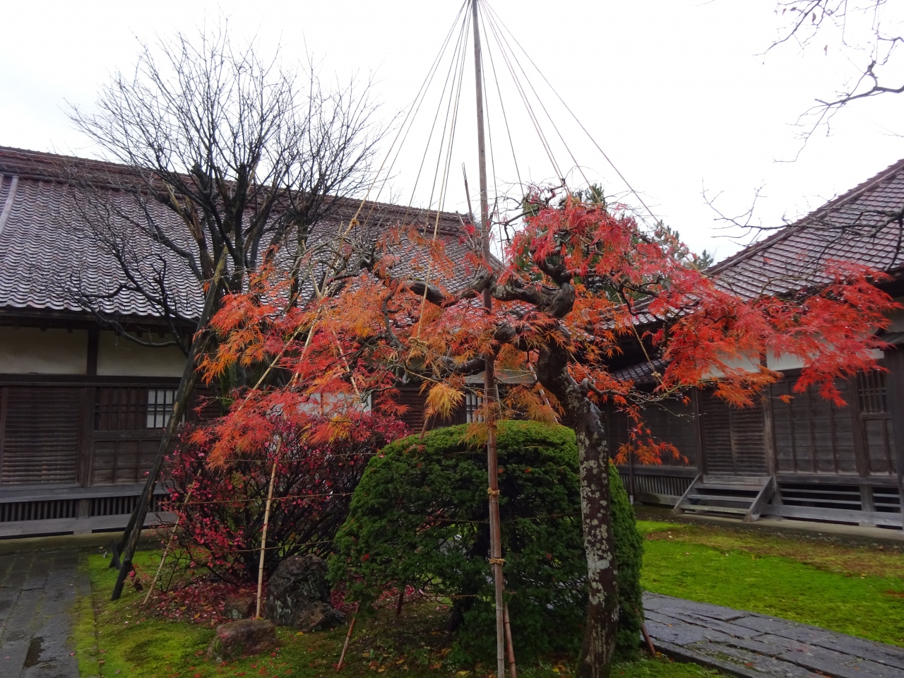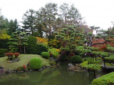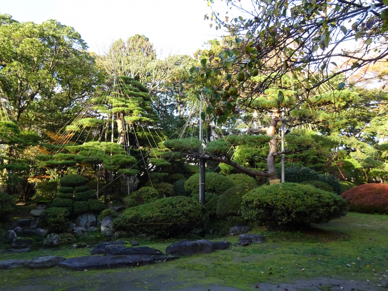 こちらの見どころは庭園。多くの種類の樹木が植えられ四季それぞれの景色を楽しめるようになっています。訪れた時期は11月上旬。紅葉には少し早かったものの、冬に備え雪吊りが見られました。
