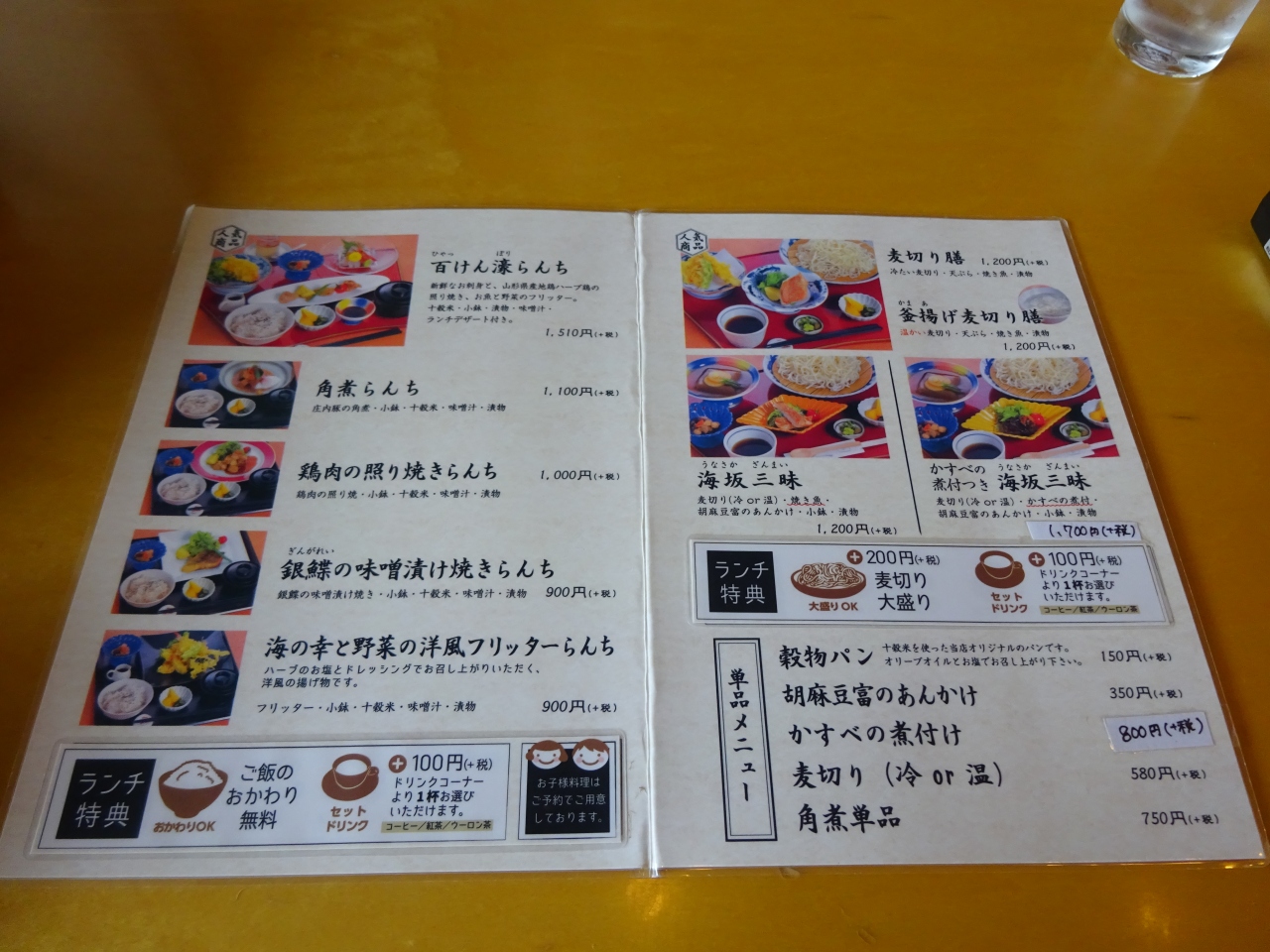 鶴岡名産の「麦きり膳」を注文。初めて麦切りを食べましたが、細身のうどんといった感じでのど越しが良いのが特徴。同行者は人気NO1メニュー「百けん濠らんち」をオーダー。食材が多い料理が1500円程度とお得感いっぱいのセットです。- 旅行時期