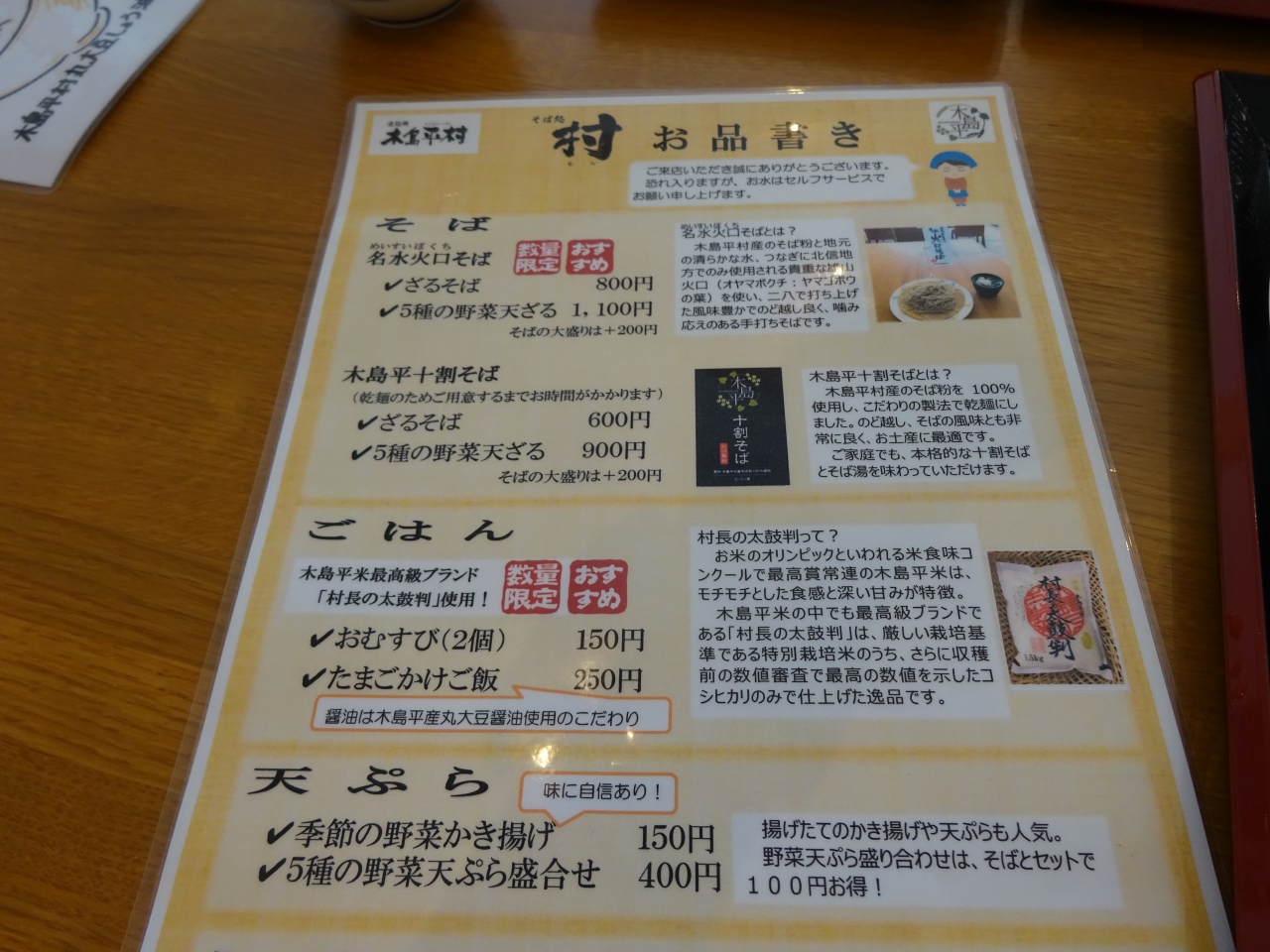 そば処「村」では、木島平産のそば粉を使った手打ちそばや、特産の木島平米によるおにぎりなどが食べられます。良心的な価格設定で味にも満足しました。- 旅行時期