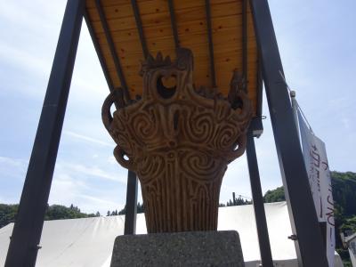 駐車場に入ると火焔型土器のオブジェに目を引かれます。火焔型土器は新潟県の信濃川沿い中心に分布するとのことですが、ここ栄村の遺跡からも出土されたようです。