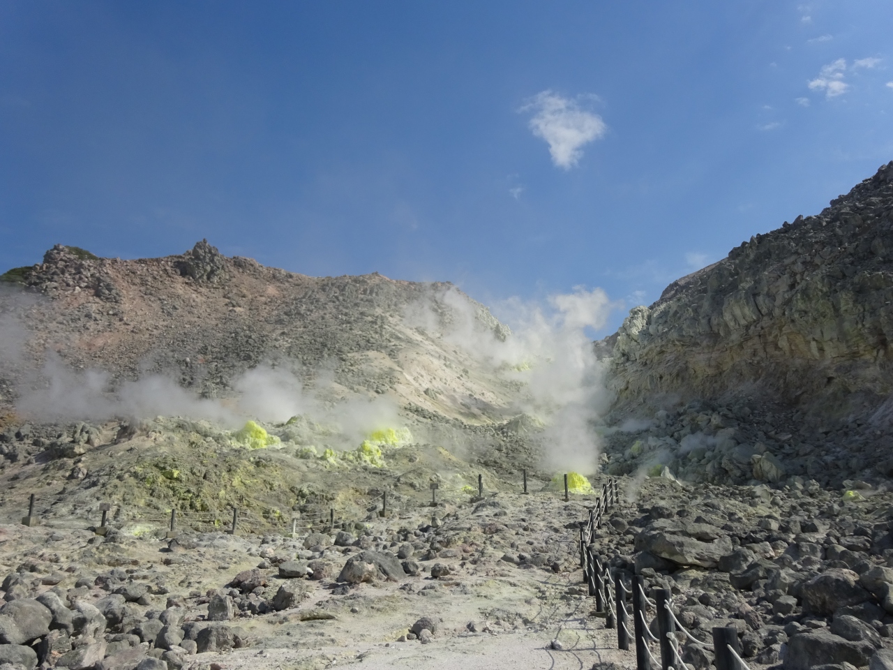 駐車場で車を降りると硫黄の臭いに包まれ、また正面にはごつごつした岩肌から噴煙が立ち上る様子が見られるなど独特の世界観が広がります。