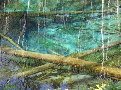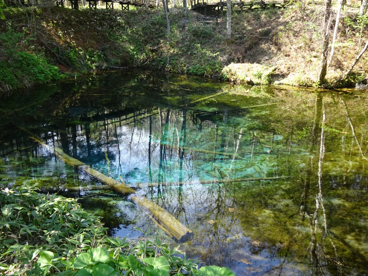 水の透明度が高くコバルトブルーの湖底がとても神秘的に感じられます。池の中には沈む倒木がすぐ近くにあるように見えますが、実際は水深が5メートルもあるとのこと。