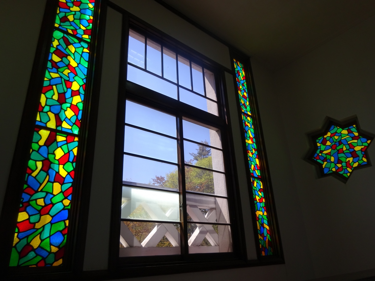 建物の外観、内部とも味わい深く、階段踊り場のステンドグラスや2階から上がる螺旋階段などに眼を惹かれます。