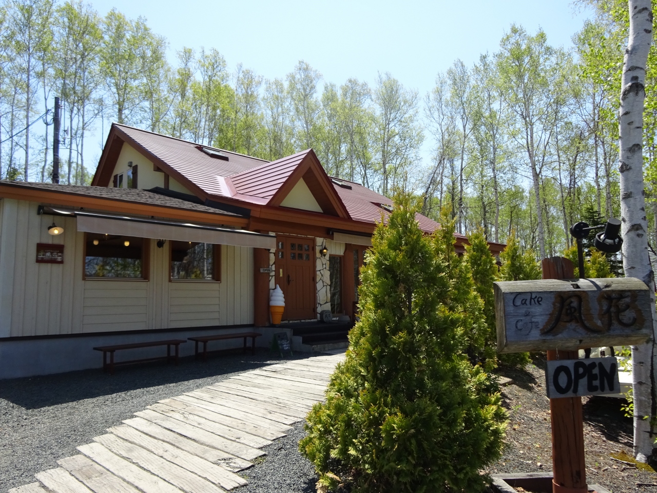 高台にあり駐車場やテラスからは網走湖が眺められます。また周りは白樺の森で自然が豊か。店内もお洒落で落ち着いた雰囲気です。