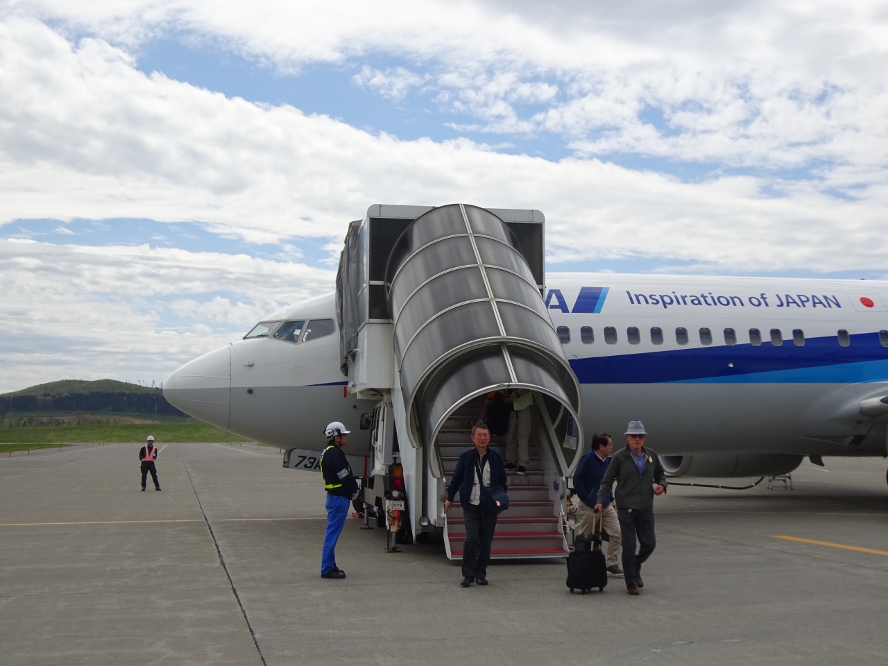 この空港にはPBBがなく屋根付きのタラップでの乗降。ターミナルビルまで外を歩くので、雨天時や冬場は辛そうですが、短時間で到着ロビーに抜けることができます。